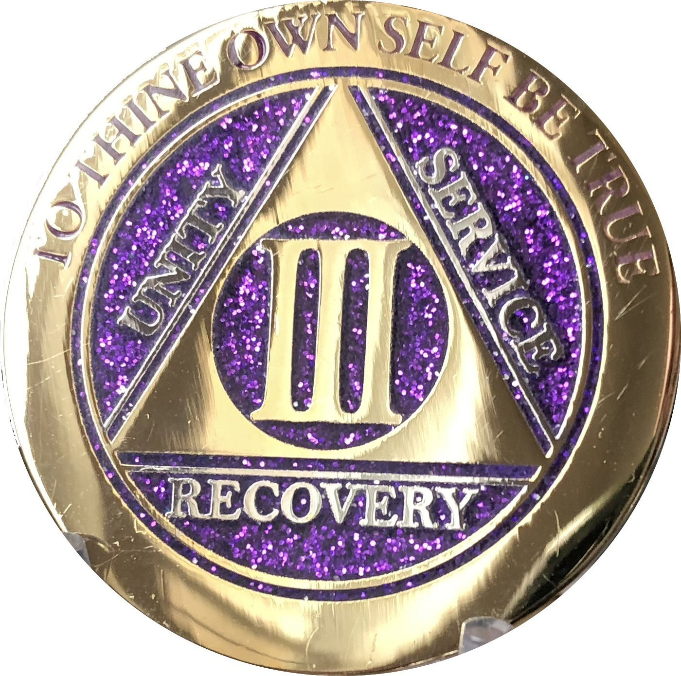 3 Year Aa Medallion By Recoverychip In Elegant Purple Glitter And Gold Plated Design. Extra Thick For A Premium Weight And Feel 33X3Mm. Coin Has Very Glossy Gold Plating And The Serenity Prayer On Back. Unity Service Recovery In Silver On Front. Comes In A Protective Vinyl Pouch. Great Gift Item For Members Of Alcoholics Anonymous Celebrating 3 Years Of Sobriety.