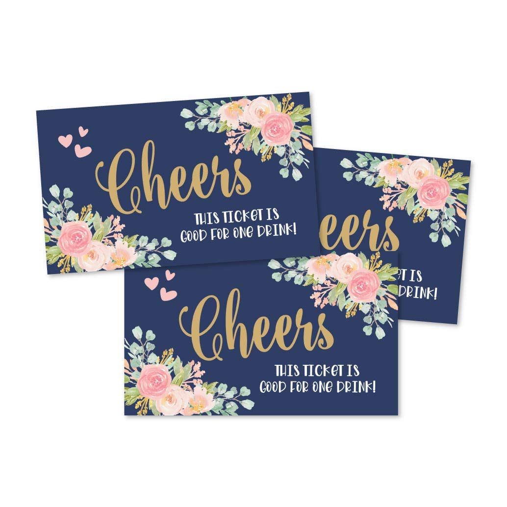 50 Navy Pink Floral Drink Ticket Coupons For A Free Drink At Weddings, Work Events Or Party Bar, One Free Beer Wine Alcohol Soft