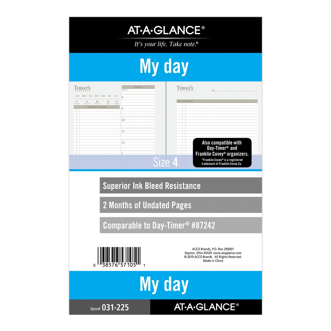 Keep Track Of Deadlines, Special Events And More With Clear And Simple Organization. The At-A-Glance Daily Planner Refill Covers 2 Months And Is Undated For Anytime Use, Giving You The Freedom To Plan On Your Own Schedule. Simply Fill In The Date At The Top Of Each Page To Mark Your Place. Each One Day Per Two Page Spread Has Hourly Appointments 8:00 A.M. - 7:00 P.M. And Extra Space For Notetaking And Tracking Priorities. Pages Measure 5-1/2' X 8-1/2'. Refills Allow You To Reuse Your Favorite Refillable Cover Each Year. This Refill Is Pre-Punched For Use In A 7 Ring, Desk Size (Size 4) Organizer, Sold Separately. Comparable To Day-Timer 87242.