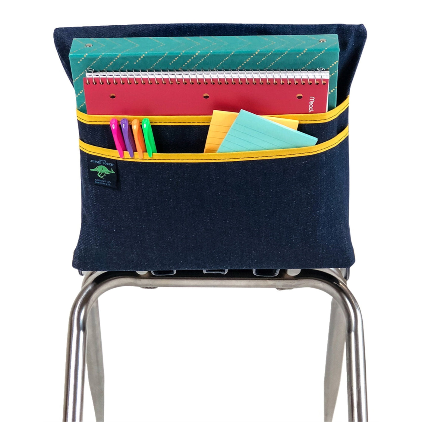 Say Goodbye To Overstuffed Desk Drawers And Covered Desktops! Aussie Pouch School Chair Pockets Take The Load Off By Neatly Compiling Classroom Supplies Right At The Back Of Childrens Seats. These Premier Quality Pockets Are Manufactured With Heavy Weight Denim That Is Machine Washable And Lasts Up To 10 Years! Two Large Pockets (With Solid Yellow Trim) Hold A Variety Of School Supplies, Notebooks, Books, And Smaller Essentials Like Tape, Rulers, Pens, And Beyond. Extra-Large Sized Pouch Pocket (At 19 Inches) Fits Chairs With A Backrest With Top Measuring 16 To 18 Inches Wide And A Bottom Measuring 16 To 18 Inches Wide. The Denim Wash May Have A Slightly Blackish Undertone (Hues May Have Variations) To Lend An Authentic Touch.