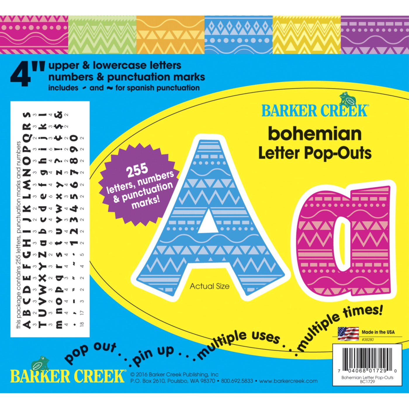 Barker Creeks 4 Inch Letter Pop-Outs Set Contains 18 Sheets With A Total Of 255 Die-Cut Pieces That Include Upper And Lowercase Letters, Numbers And Punctuation Marks. Attractive Pop-Out Is Easy-To-Use Making It Perfect For Presentation, Report, Poster, Scrapbook Page And Is Long Lasting. Made In The Usa.
