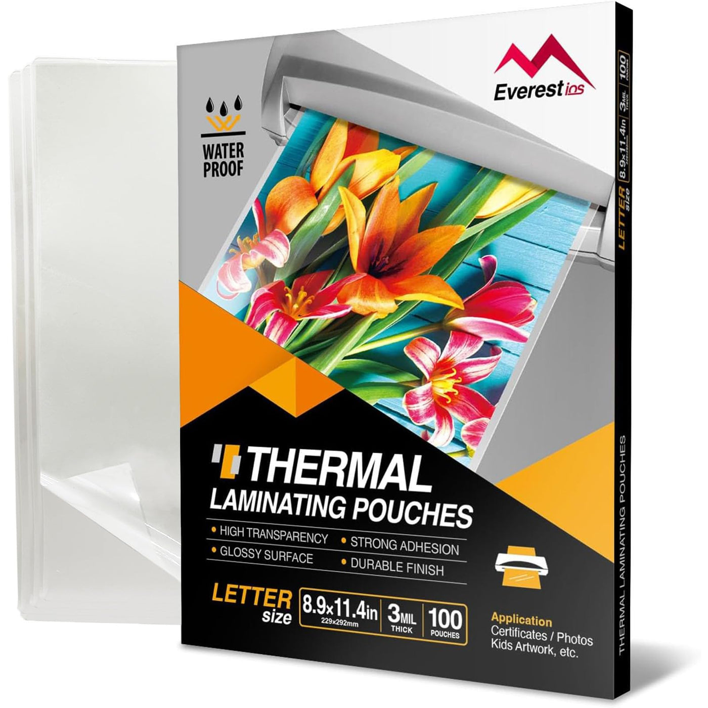 Everest Thermal Laminating Sheets, 8.9 X 11.4 Inches, 3 Mil Thick(80 Mic), 100 Pack, Letter Size Laminating Pouches, For Educati