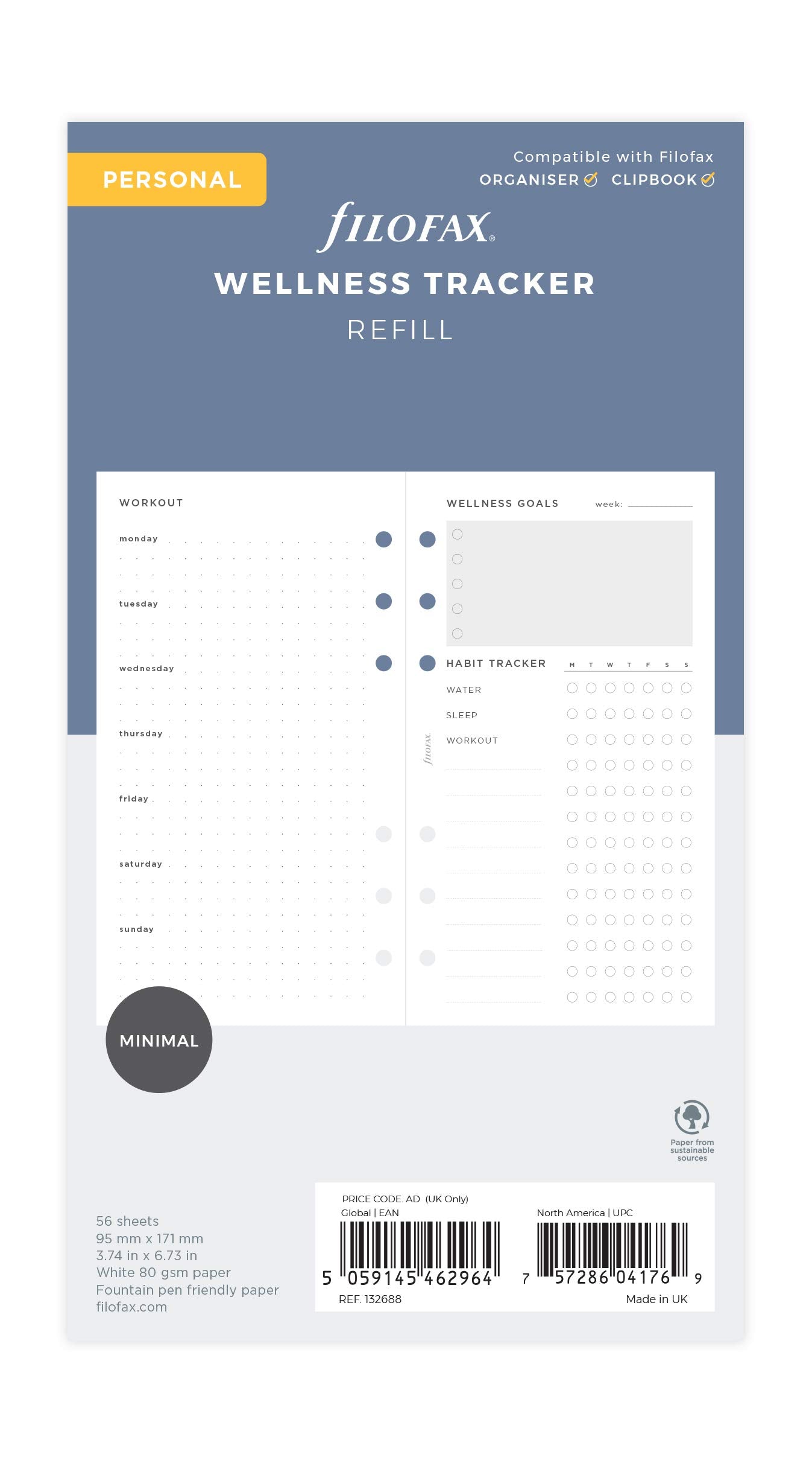 Look After Number One With Our Stylish Personal Size Wellness Refill. Featuring Pages For Exercise, Goals And Tracking Habits. Compatible With Your Personal Size Filofax Organiser Or Clipbook. This Refill Pack Has 56 Sheets Of White 80Gsm Paper. Not Suitable For The Filofax Refillable Notebook.