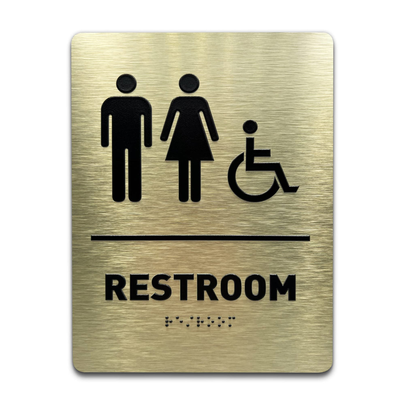 About Gds Architectural Signage Solutions From Creative Conception To Final Installation, Gds Has Developed The Most Effective And Efficient Process For Outfitting Any Built Environment With Wayfinding And Identification Signage For Both Interiors And Exteriors. Our Mission Is To Navigate Commercial Environments Through Strategic Planning And Tangible Solutions. Modern Bathroom Sign To Match Any Commercial Interior Our Restroom Signage Is The Perfect Way To Help Direct All Of Your Employees, Guests, And Patrons To The Proper Facility In A Commercial Space. Their Minimalistic Design And Contemporary Metallic Finishes Match The Interior Style Of Any Workspace, Hotel, Restaurant, Retail Store, Or Commercial Environment. Simple & Damage-Free Installation Our Commercial Restroom Signs Can Easily And Quickly Be Mounted To Any Smooth, Flat Wall Without Damaging Its Surface. These Bathroom Signs For Businesses Should Be Installed On The Wall That Is Adjacent To The Side Of The Door With The Handle Or Latch. And Thanks To Our Included Adhesive Strips, You Can Securely Hang The Sign With Ease - No Additional Tools Required! Specifications Color: Brushed Gold Dimensions: 6' W X 8' H