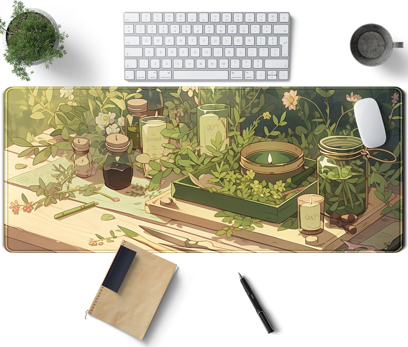 Green Gardener Desk Mat Anime Forest Xl Gaming Mouse Pad Plant Lover Desk Pad With Stitched Edges, Women Desktop Decor Mousepad