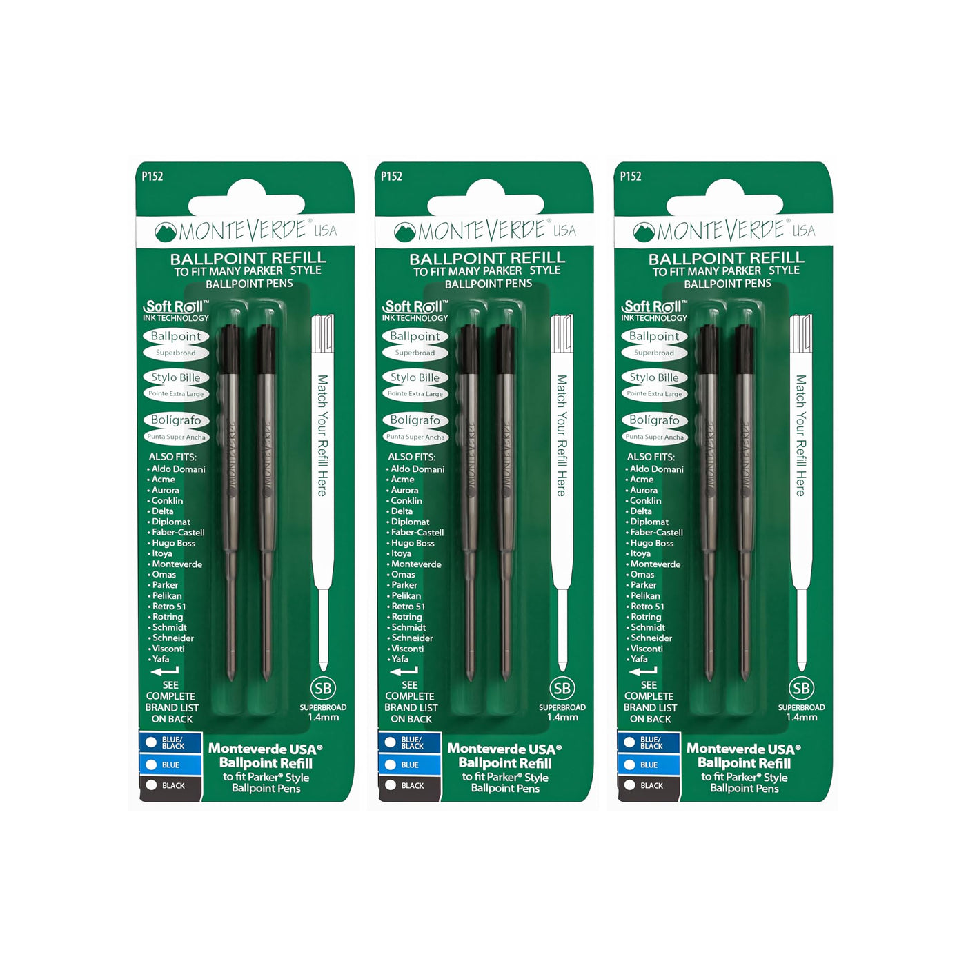 Monteverde P153Bk Soft Roll Ballpoint Refill To Fit Parker Pens, Black, 6 Pack