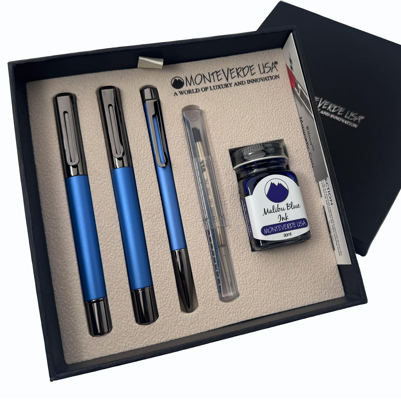 Monteverde Ritma 3+2 Piece Gift Set, Blue - Includes Stub Nib Fountain Pen, Rollerball, Ballpoint, 30Ml Ink & Refill - Premium W