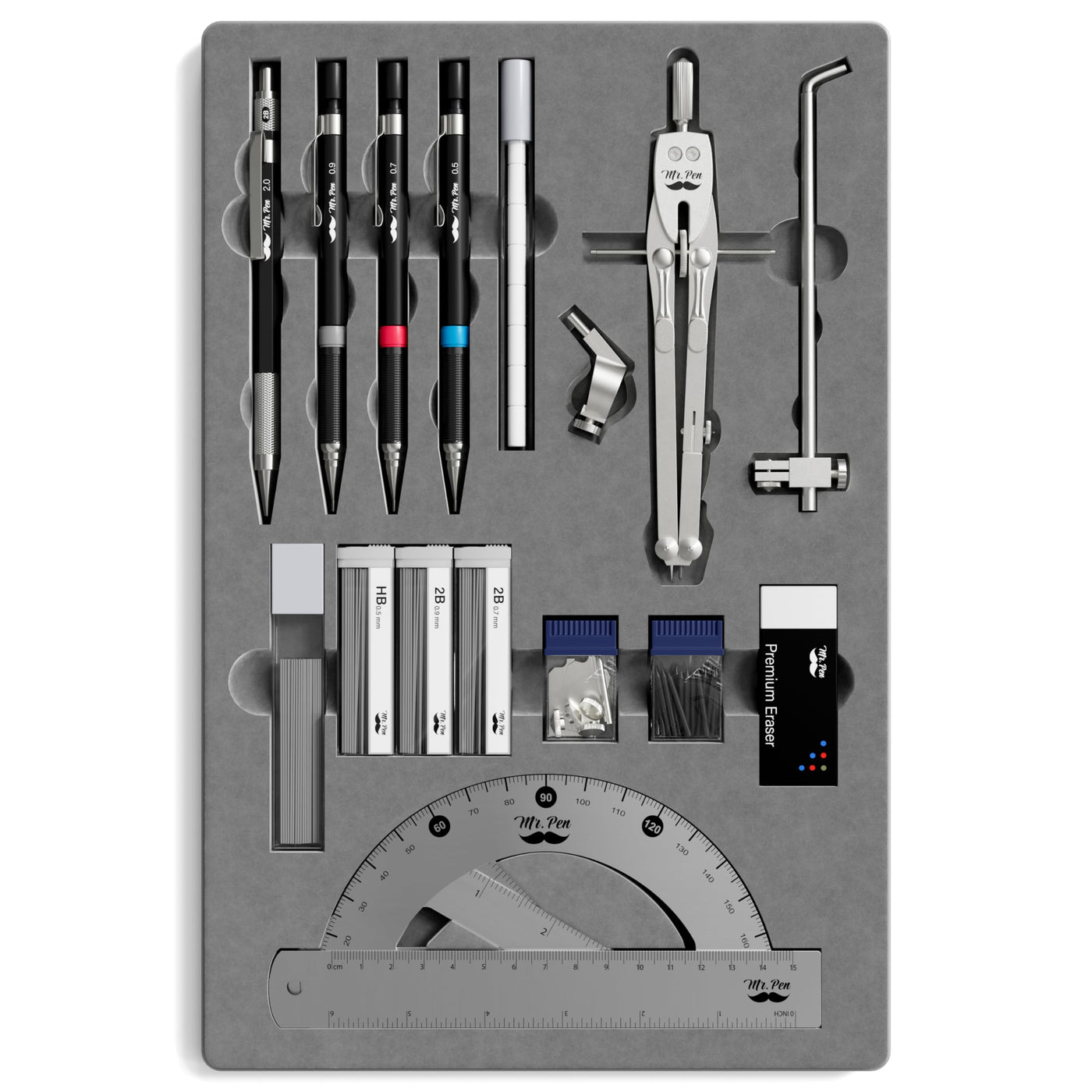 Mr. Pen Mechanical Pencil Set Includes 4 Versatile Sizes (0.5, 0.7, 0.9, And 2Mm) To Cater To A Wide Range Of Drawing And Writing Needs, Providing Precision And Versatility For Technical Drawings, Sketches, And General Writing. Crafted With A Robust Construction, These Mechanical Pencils Offer A Balanced Weight That Ensures Comfortable Handling And Reduced Fatigue During Long Drawing Sessions Or Extensive Writing Work. This Set Is Not Just About Pencils; It Also Includes A Metal Compass With An Extension Leg, Extra Screws And Needles, Eraser Refills, And Four Tubes Of Lead Refills, Making It A Complete Package For Professionals And Students Alike. For Detailed Measurement And Drawing, The Set Comes Equipped With A Metal Protractor, A 6-Inch Metal Ruler, And Two Set Squares (45 And 30/60), Enhancing The Functionality For All Levels Of Drafting And Design Projects. Everything Is Neatly Organized In A Sturdy Case, Ensuring That All Tools Are Secure And Easily Transportable, Making It An Ideal Choice For Architects, Engineers, Artists, And Anyone Who Desires A Reliable And Comprehensive Drawing Toolkit.