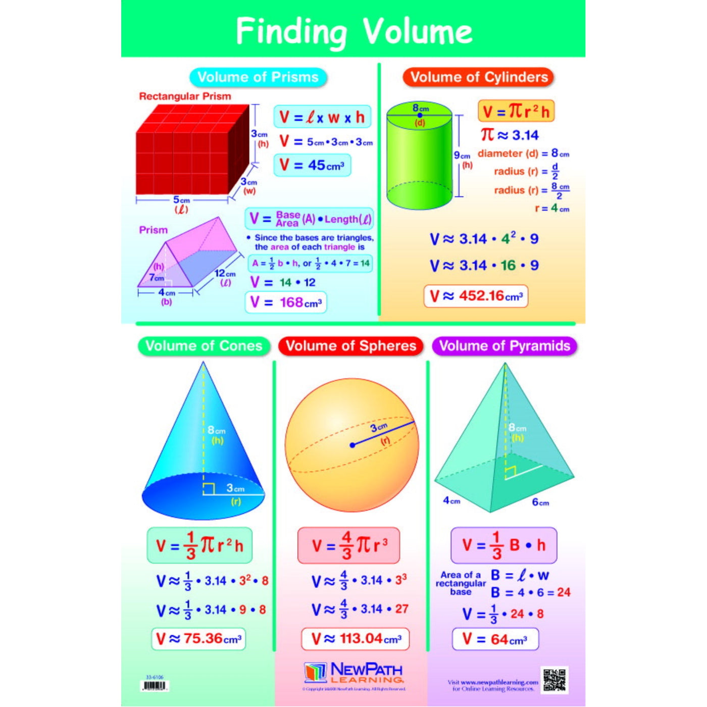 Newpath Learning 'Finding Volume' Poster For Grades 5 - 9 Measuring 23 In X 35 In Offers A Detailed Look At The Topic And Is Laminated For Yrs Of Use. Poster Features A Graphic Representation Of The Formulas Used To Determine Volume Along With Pictorial Examples For Prisms, Cylinders, Cones, Spheres And Pyramids.