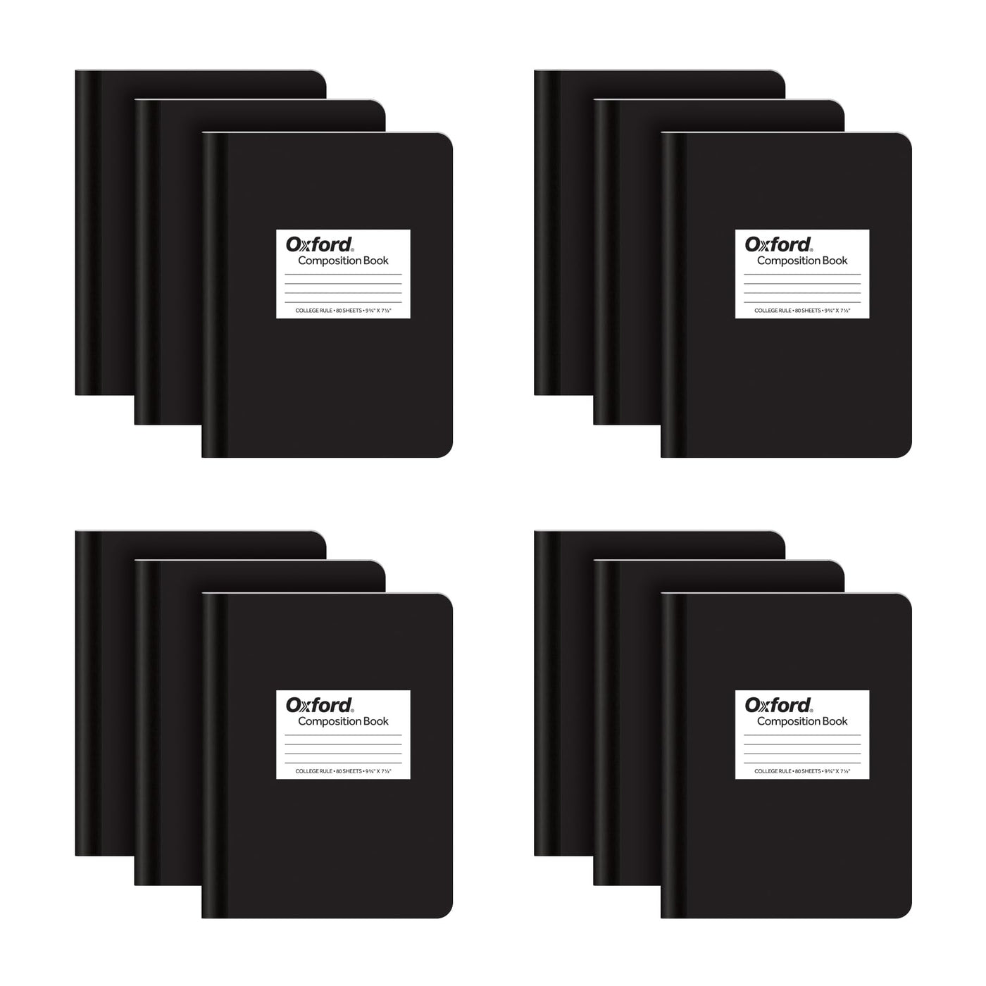 Oxford Composition Notebook Bulk Packs Have 12 College Ruled Notebooks With Black Covers. Stock Up For The School Year! Each Has 80 Double-Sided Sheets/160 Pages Of College Ruled Paper. College Ruled Paper Has Less Space Between Lines To Fit More Creative Writing, Journaling, Note Taking Or Lab Work Per Page Than Wide Ruled Paper. Paper Handles Ink Pens, Colored Pencils And Highlighters For Fun Writing Practice And Beautiful Notes. Center Sewn Pages Make The Composition Notebook A Teacher Favorite. Creates A Permanently Bound Journal, Science Notebook, Bullet Journal Or Writing Notebook. Covers Have A Space For Name And Class, And A Blank Class Schedule And Conversion Charts Are Inside. A Great Notebook For School! College Ruled Paper. 9-3/4' X 7-1/2'. 80 Sheets/160 Pages. 12 Pack Of Black Notebooks.