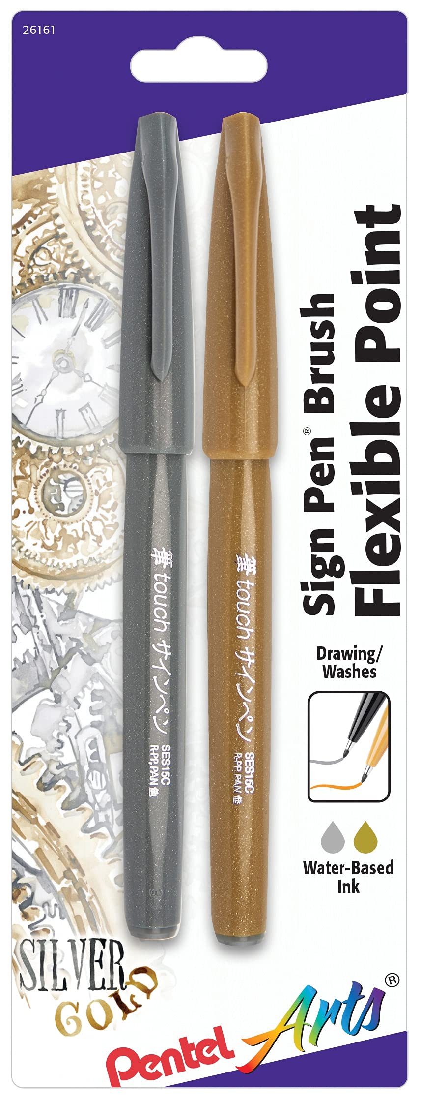 Pentel Arts Sign Pen Touch, Fude Brush Tip, Gold/Silver, Pack Of 2 (Ses15Cbpxz)