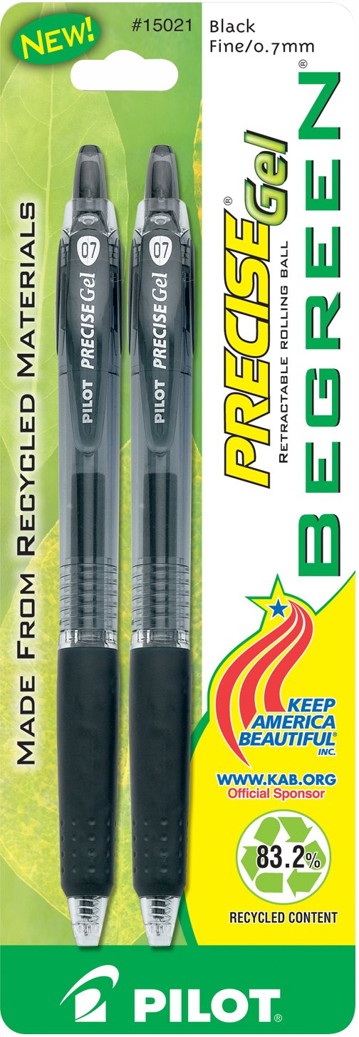 Product Descriptionan Earth-Friendlier Pen, The Pilot Begreen Precise Gel Pen Is Made From 83.2% Recycled Materials, And Can Be Refilled, So You Can Use This Pen Over And Over Again. The Dynamic Gel Ink Formula Gives You Smooth, Swift Writing And Is Refillable With Pilot G2 Ink Refills. Each Pen Features Patented Precise Needle Point Technology That Lets You Draw Or Write With The Finest Line. Pilot Begreen Pens Meet Iso 14001 And 14021 Standards For Environmental Responsibility. Pilot Pen Is Proud To Provide Consumers With A Wide Selection Of Responsible Choices That Can Be Part Of Their Everyday Commitment To Make Our Planet Cleaner And Healthier. Pilot Begreen - Positive With The Planet!From The Manufacturerprecise Gel Begreen Pen Is Made From 83.2 Percent Recycled Material. Dynamic Gel Ink Formula Delivers Smooth Writing And Smear-Proof Ink. Design Features Patented Precise Needlepoint Technology, Retractable Rolling Ball Tip, And A Rubber Grip With Traction Pockets For Easy Gripping And Long-Lasting Comfort. Gel Pen Meets Iso 14001 And 14021 Standards. Refillable With G2 And Q7 Refills.