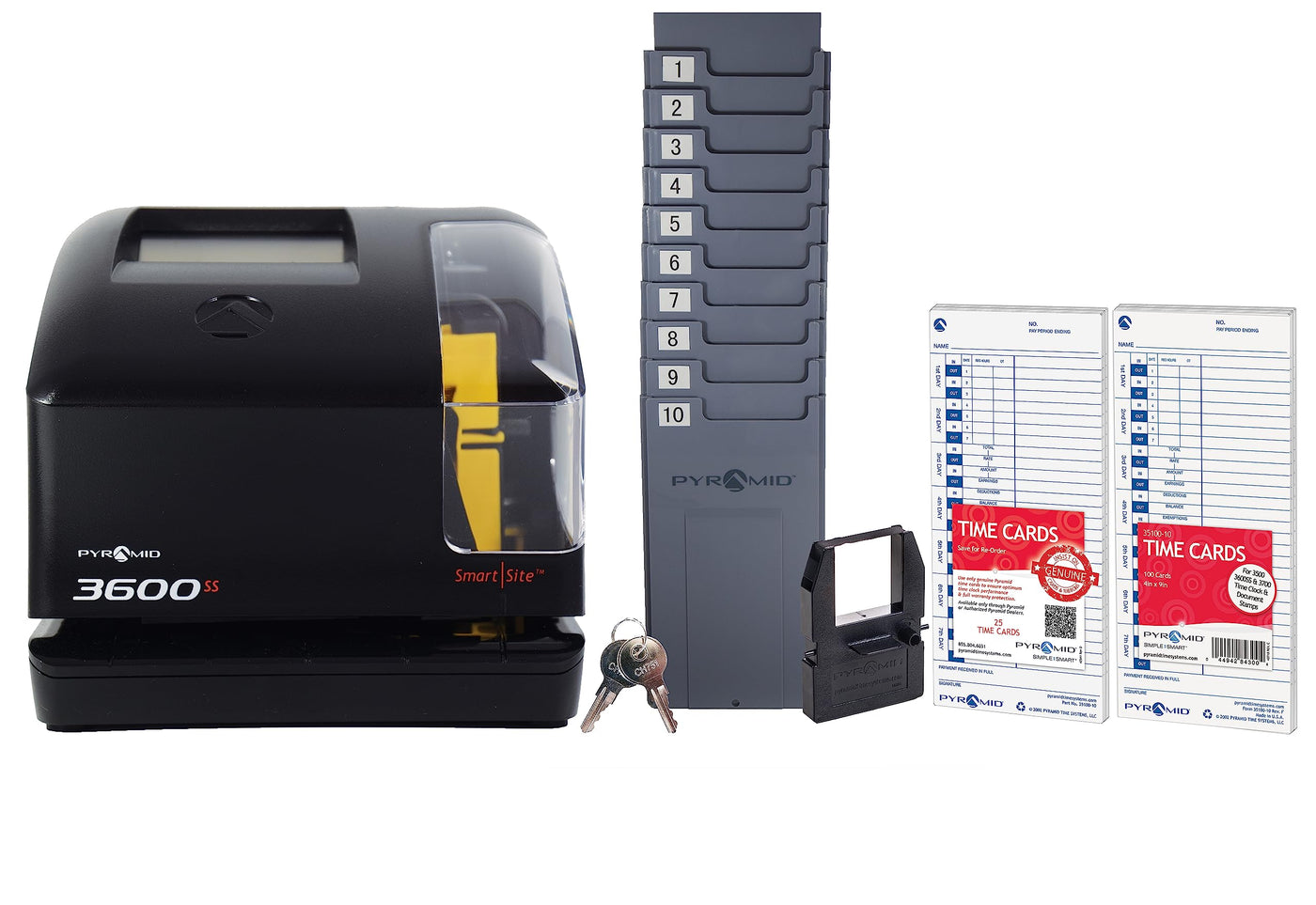 The Pyramid 3600Ss Smartsite Time Clock And Document Stamp Exemplifies Versatility By Performing Employee Time Tracking, Job Costing, Document Stamping, Custom Messaging, Counter And Sequential Page Numbering. Exclusive Smartsite Led Alignment Guide And 3-Way Viewing Window Help The User To Quickly And Precisely Align Time Card Punches And Document Time Stamps. Select From 14 Pre-Programmed Business-Minded Messages Or Create Your Own Custom Message Up To 2 Lines Of Alphanumeric Text. The Counter Mode Allows You To Stamp Sequential Page Numbering Up To 9999. An Adjustable Document Edge, Side-Loading Document Feed Accommodates Various Paper Sizes And Enables Right Or Left Hand Printing. Choose From English, Spanish Or French Printing. Includes 100 Time Cards, Time Card Rack, Ribbon And 2 Security Keys. Proudly Made In The Usa. Pyramid Is An Original Equipment Time Clock Manufacturer In The United States And Has Been Producing Time Clocks Since 1969. Pyramid Time Systems Takes Pride In Designing, Engineering And Manufacturing Quality Products Using Premium Materials Right Here In The United States. All Of Our Time Clocks, Time Clock Systems, Wireless Clocks And Accessories Undergo Rigorous Operation, Endurance And Temperature Testing To Optimum Performance, Dependability And Customer Satisfaction.