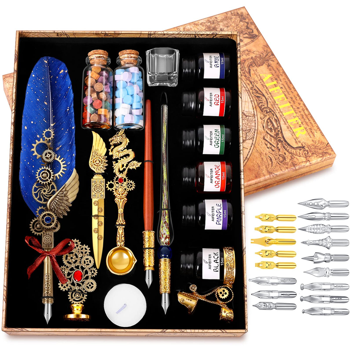 Quill Pen Ink Set Includes: 1*Quill Pen, 1*Glass Dip Pen, 1*Wooden Dip Pen, 6*Bottles Of Ink (6 Colors: Black,Red,Orange,Purple,Green,Blue), 1*Ink Glass Cup, 17*Stainless Steel Nibs Of Different Sizes, 2 *Bottles Of Wax Lacquer, 1*2-In-1 Pen Holder, 1*Round Candle, 1*Mechanical Seal Pattern, 1*Wax Melting Spoon With Dragon Handle, 8* Pieces Of Letter Paper, 2 *Pieces Of Envelopes, 1*Open Envelope Tool, 1*Exquisite High-End Gift Box Features 17 Nibs: Test Salad Bars With 4Mm Gold Parallel Nibs Included. 5 Special Double Round Decorative Nibs, Perfect For Creating Serif Letters Without Thick And Thin Lines. 5 Flat Nibs For Gothic Writing. 6 Flexible Tips For Writing Round, Italic Characters. To Replace The Nib, Simply Pull Out The Old Nib And Insert The New Nib. All Nibs Are Compatible With Each Other For Smooth Writing And Easy Cleaning. Beginners Try Different Nibs To Find The Best Nib For Writing Or Drawing