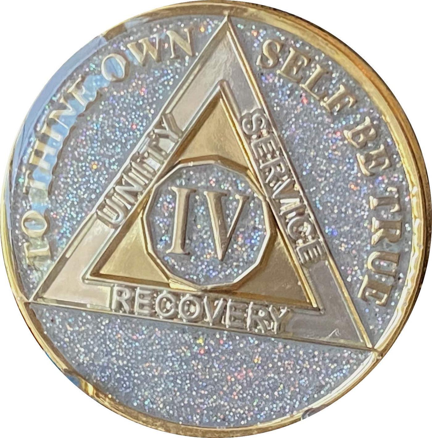 4 Year Aa Medallion In Silver Opal Glitter Multi-Color Color. This Is A Tri-Plate Sobriety Chip With Gold And Nickel Plating And A Glass Like Epoxy Dome. Serenity Prayer On The Back. 1 3/8 Diameter Size. Excellent Recovery Gift For Members Of Alcoholics Anonymous