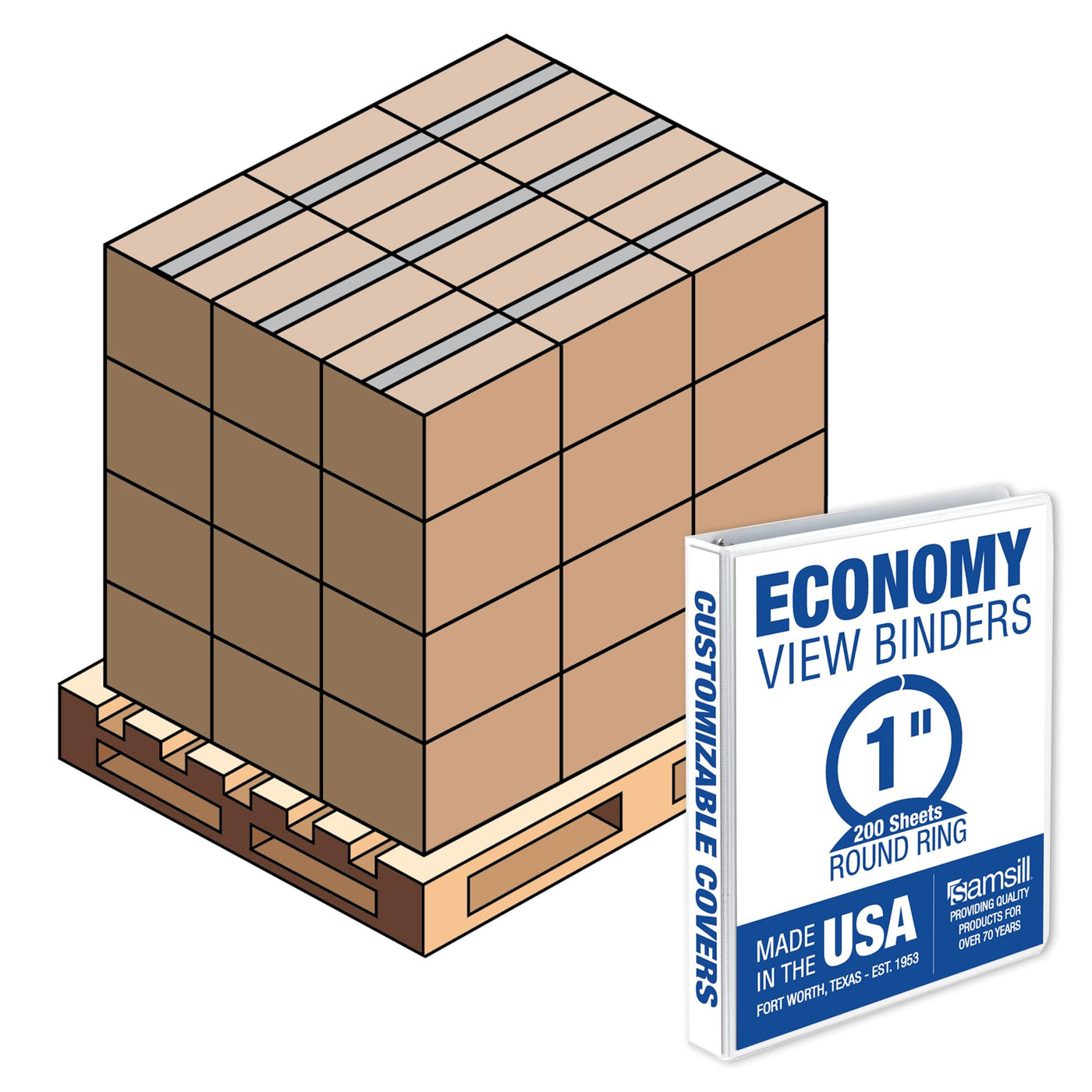 Samsill 1 Inch 3 Ring Binders, Made In Usa, Economy Round Ring With Clear View Cover, 200 Sheet Capacity, White, Pallet Of 864 B