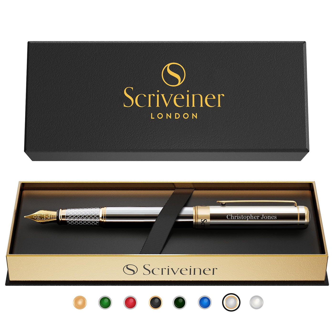 Luxury Fountain Pen By Scriveinerbeautifully Crafted Out Of Brass With A Silver Chrome Finish And 24 Karat Gold Appointments. The Quality Of Craftsmanship And Materials Is Usually To Be Found Only In Pens Costing Many Times More. This Is A Pen That Will Impress In Any Environment. Whether In An Executive Boardroom, A Coffee Shop Or On The Road, Your Pen Will Draw Admiring Glances And Comments.A Superb Writing Experienceour Pens Use A German Schmidt Nib Which Has A Beautiful Feel And Allows You To Write Effortlessly On Any Type Of Paper. You Will Appreciate The Smooth Writing Style And Our Pens Are Perfect For Beautiful Calligraphy.Exquisite Presentation Gift Boxthe Pen Is Beautifully Presented And A Hidden Compartment Underneath Holds Two Spare Cartridges. Whether For An Anniversary, For Christmas, For A Birthday Or Simply For Yourself, Whoever Receives This Pen Will Be Delighted. If You Are Looking For The Perfect Gift For Any Occasion, Look No Further!Includes:?? One Scriveiner Fountain Pen With Installed Schmidt Converter?? One Presentation Gift Box?? Two Spare Cartridges (One Black, One Blue) In Envelope Under Pen Tray?? Warranty Cardbuy With Total Peace Of Mind!We Are So Confident That You Will Love Your Scriveiner Pen That We Offer A 100% Manufacturer Guarantee. Simply Register Your Purchase And You Are Free To Return Your Pen Within 730 Days For A No Questions Asked Replacement. And, If You Return It Within The First 30 Days We Guarantee A Full Refund. So What Are You Waiting For? Click Add To Cart Now To Order This Incredible Pen!