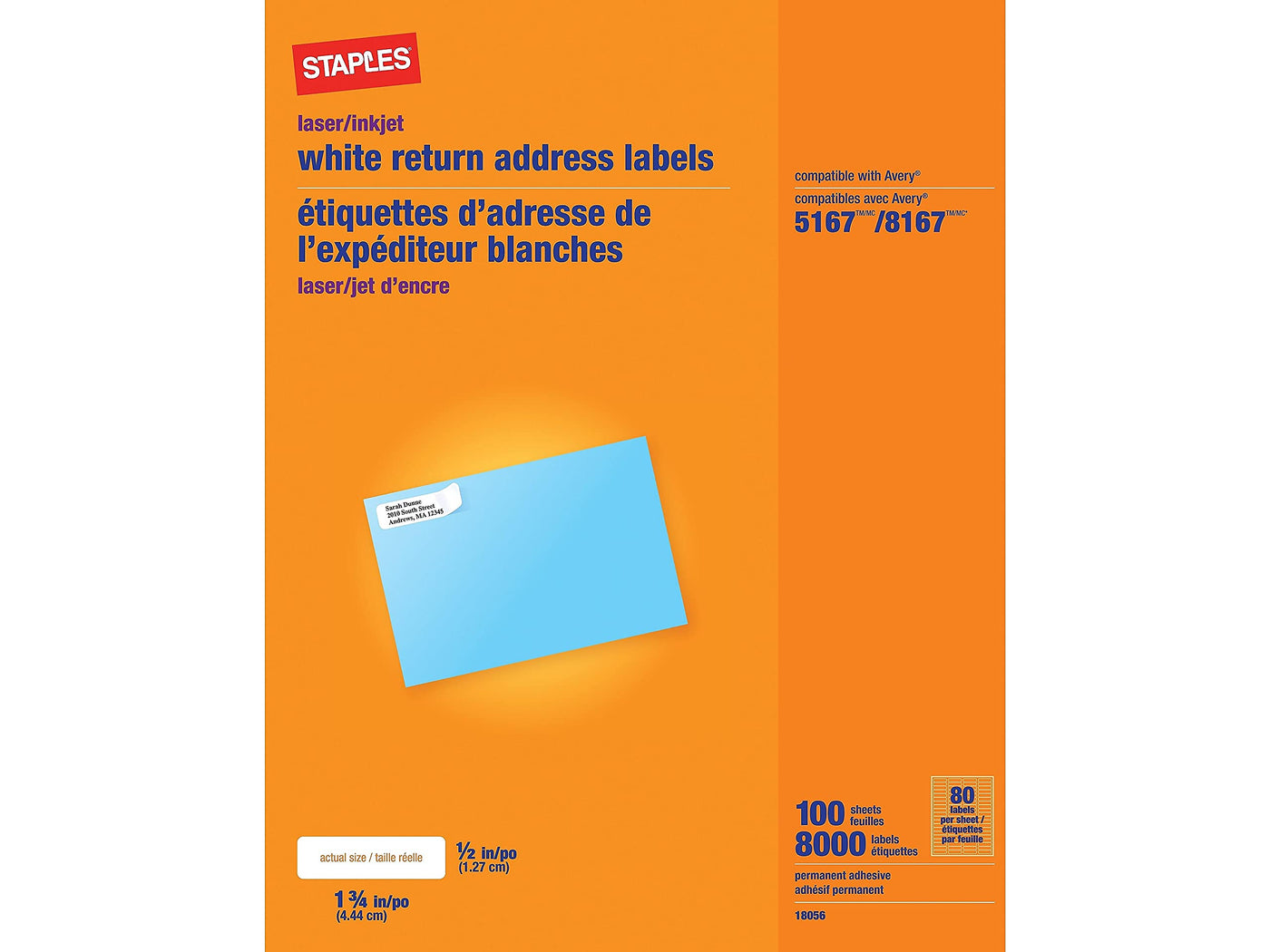 Take Care Of Massive Mailing Projects With This 8,000-Pack Of Staples 0.5 X 1.75-Inch White Inkjet/Laser Return Address Labels. Choose These Staples Return Address Labels For Large Shipping Projects. Each Label Is Matte White, So You Can Print Or Write On Them With Any Color For Vivid Images And Crisp Text, While The Permanent Adhesive Helps Ensure Labels Stay Securely Attached To Mail. These Staples Return Address Labels Are Compatible With Inkjet And Laser Printers.