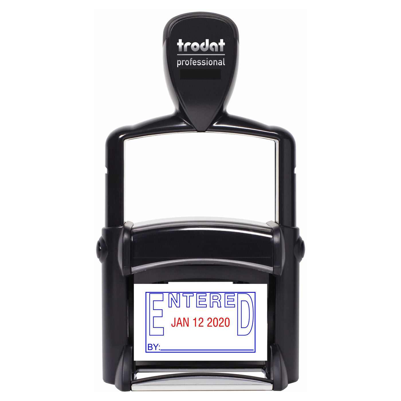 Trodat 5440E4-B/R - Self-Inking Entered (Outline Text) Date Stamp With Outside Border And By: Line, Blue/Red Ink, 1.75' Thick,