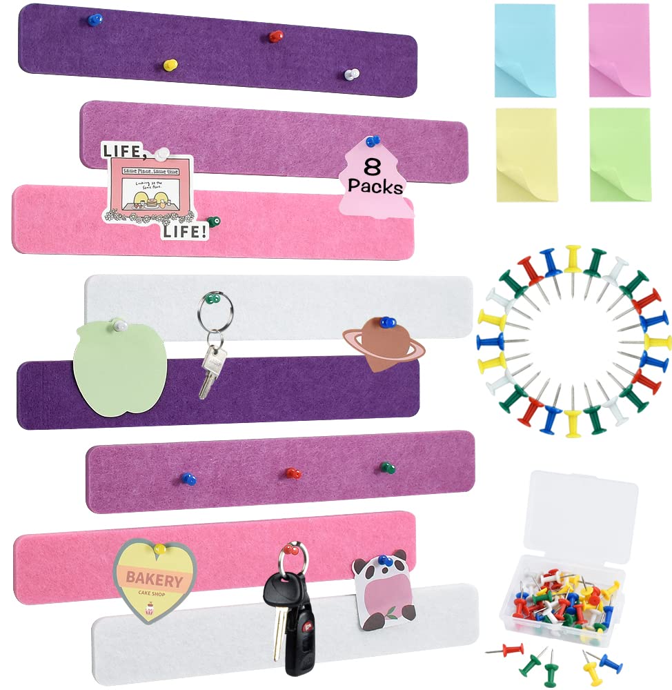 Packing List:8 Self-Adhesive Felt Bulletin Board Strips 13X1.97X0.47 Inch Thick50 Push Pins Random Colors.Thick Enough:Each Felt Bulletin Strip Is About 0.47 Inches Thick , Thick Enough For Ordinary Push Pins.Easy To Install:There Is Adhesive On The Back Of Each Felt Board Strip. Tear Off The Protective Film On The Surface Of The Adhesive Before Pasting The Felt Strip. In Order To Make It Work Well, Please Mount It On Smooth Place Like Glass/Tiles/Door, Not On Lime Wall/ Uneven Place.Reminder:1.The Pushpins Are Small Parts And Have Pointed Ends, Please Keep Away From Kids.2.The Felt Bulletin Bar Strip Set Should Be Directly Attached To Walls, Doors, Glass Windows.3.Since The Adhesive Is Very Sticky, Please Determine The Location To Be Installed Before Installation, And Do Not Move It Once It Is Attached To The Wall.