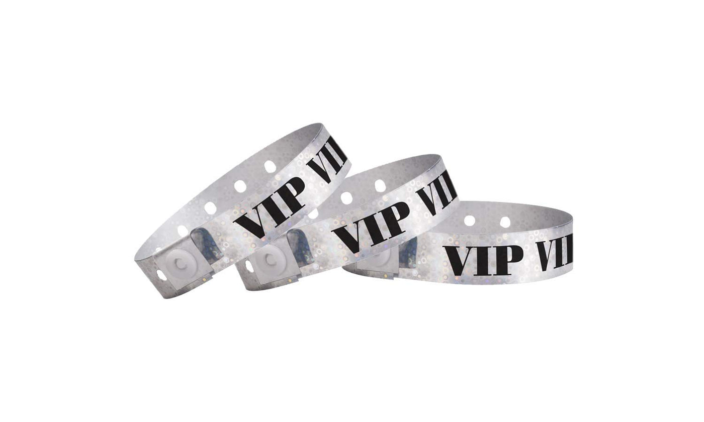 500 Holographic Silver Vip Plastic Wristbands From Wristco - The Wristbands Are Packaged In Sheets Of Twenty. Each Wristband Measures 5/8 Inches Wide By 10 Inches Long And Will Fit Most Wrists. Each Wristband Uses A Single Use Snap Which Prevents Transfer.
