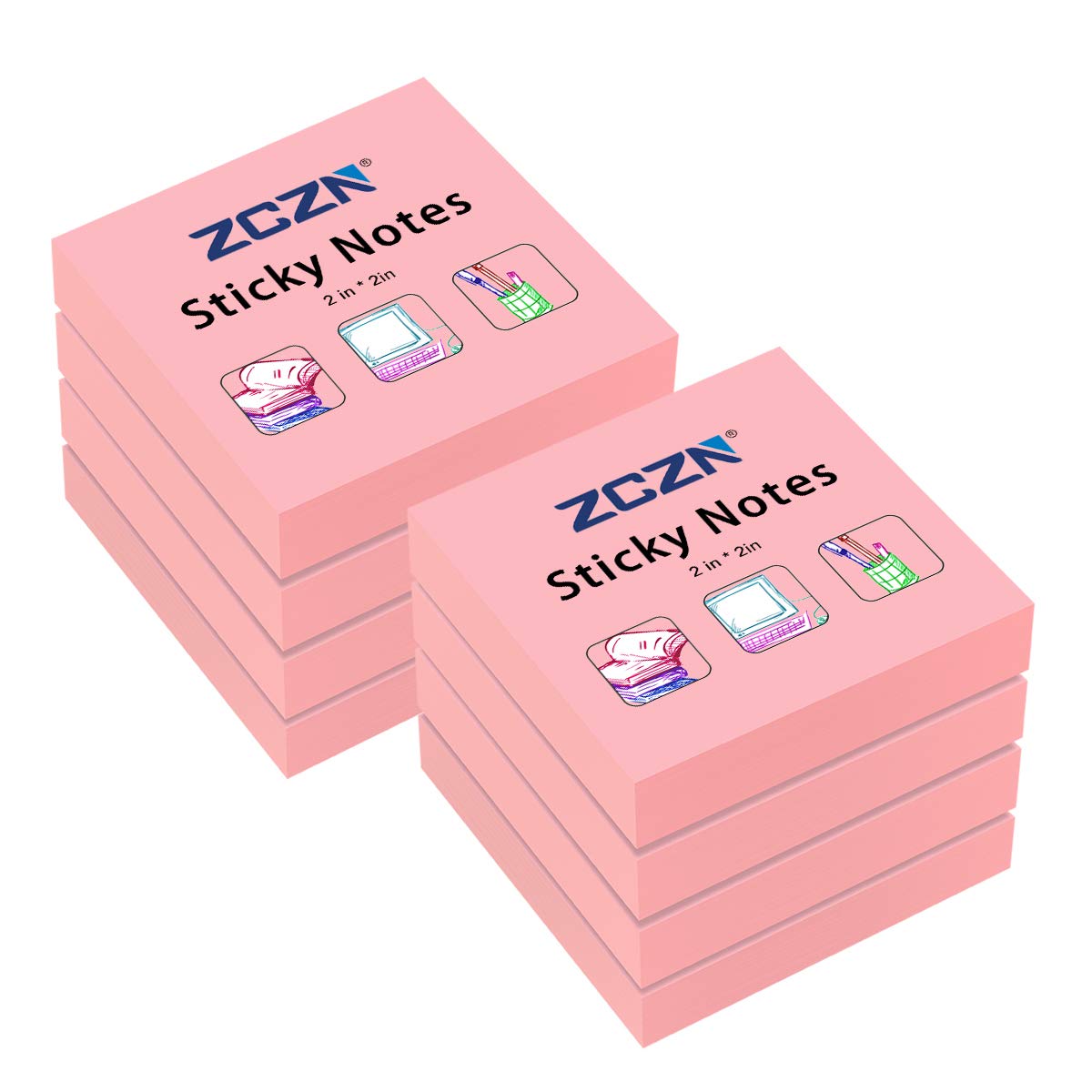 Zczn Small Sticky Notes, 2In X 2In, 100 Sheets/Pad, 8 Pads/Pack, Pink