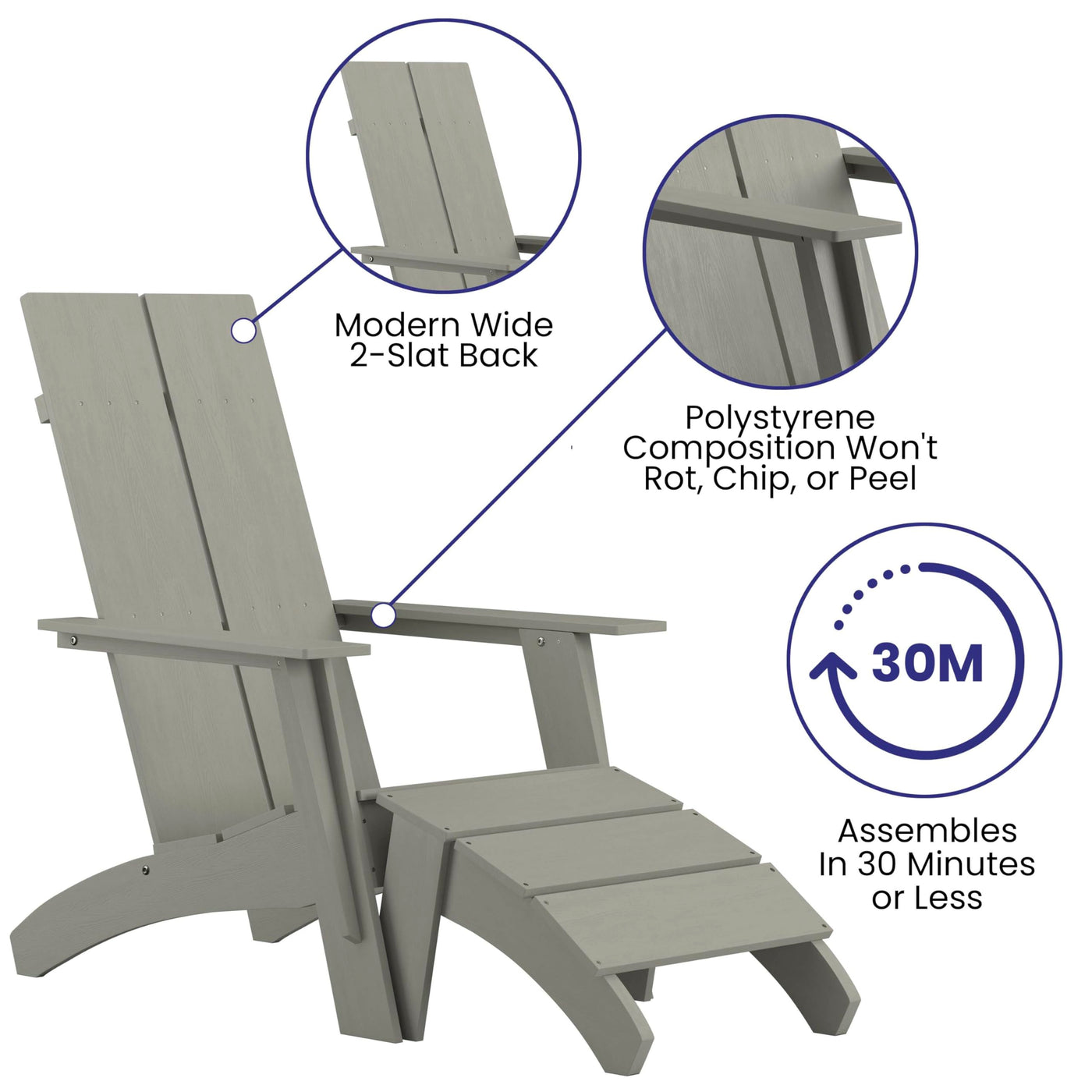 Go for a different look while retaining the comfort of a proven classic with this modern dual slat back Adirondack chair with matching ottoman. The streamlined silhouette and wide slats give this outdoor patio set a sleek profile that will complement any dcor. A perfect addition to your patio, deck, or sunroom, this versatile indoor/outdoor lounge set invites you to settle in and stay awhile. Whether you're hanging out on the deck or around the firepit in the backyard comfort is essential. The fresh look of this sleek chair and ottoman set does not detract from the amazing comfort Adirondack chairs are known for. The slanted seat encourages you to recline while the slender arms relieve pressure from the neck and shoulders. Rest your feet on the matching ottoman that mimics the look of your chairs and eases pressure on your legs for total relaxation. Boasting a faux wood look that is UV protected and constructed of weather-resistant polystyrene, this indoor/outdoor chair and ottoman are designed to hold up in many environments and accommodate up to 350 lbs. static weight and 200 lbs. static weight for the footrest. Unlike traditional wood furniture there is no back breaking sanding, painting, or sealing and this low maintenance footrest and chair set won't rot, peel, or splinter. Easily clean spills, dirt, or dust with water and a neutral detergent. Assembly takes less than 30 minutes with the included tools and illustrated instructions. This all-weather Adirondack set invites you to kick back and let the tensions of the day melt away.