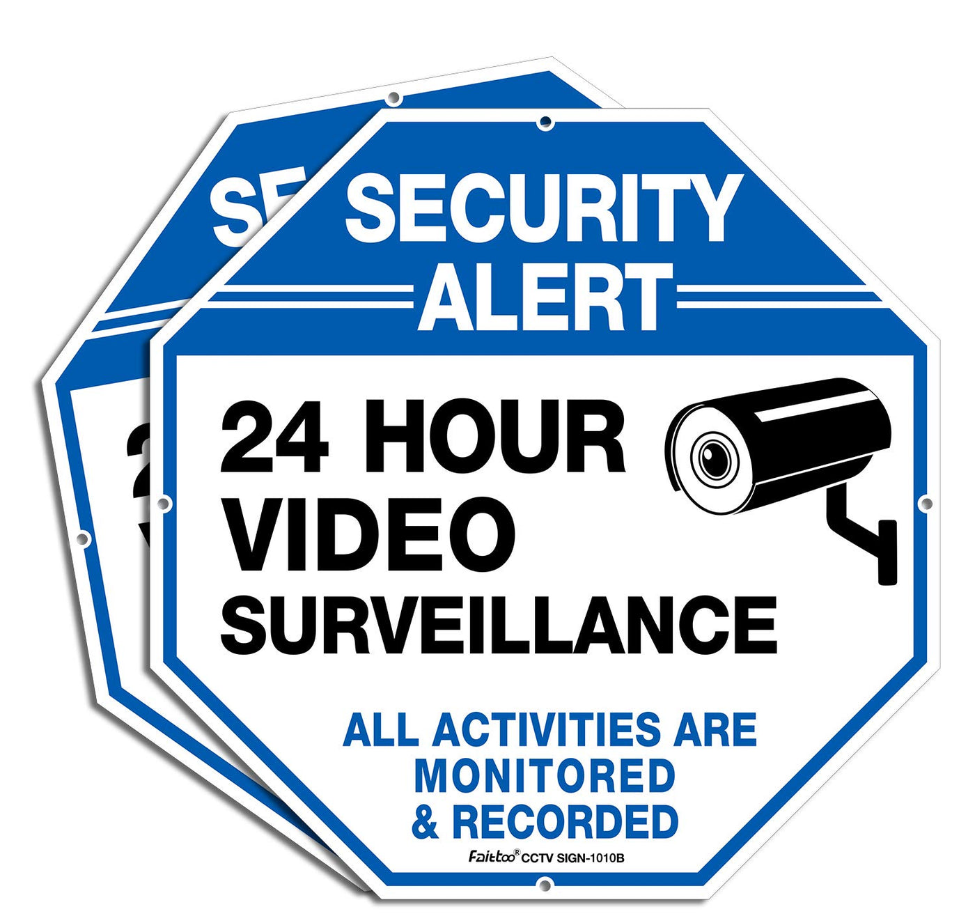 Asecurity Alert - 24Hour Video Surveillance All Activities Are Monitored & Recorded Signa&Nbspwithreflective Coatingnumber Of Items:&Nbsp2Size:&Nbsp10X 10 X 004Octagon Shape, Sleek,Rounded Cornersmaterial:040 Rust Free Heavy Duty Aluminum&Nbspeasy Mounting:&Nbsp4 Pre-Drilled Holes And Can Be Easily Mounted On Every Surfaceuv Coating Printed:&Nbspgraphics And Wordings Will Withstand The Elements And Will Not Fadeservice Temperature:&Nbsprange From 20 To 168 Degrees Flong Lifespan:&Nbspoutdoor Service Life Up To 7 Yearswarranty And Service:&Nbspworry-Free 2 Years Warranty, And 7 Days 24 Hours Online Customer Servicenotice:&Nbspthis Sign Does Not Included Screws, Nails, Zip Ties Foam Adhesives And Other Accessories