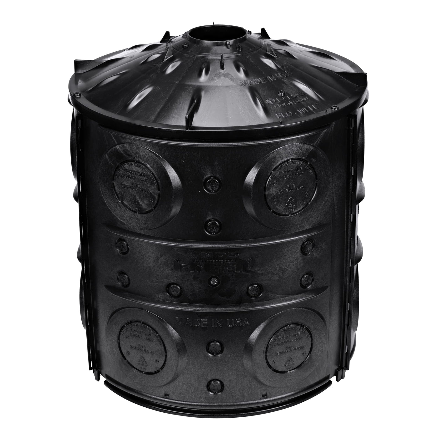 Storm Water Leaching System Is A Structural Polyolefin Round Drywell System With Uv Inhibitors. The Unit Contains 3 Side Panels, 1 Top Panel And It Fits 4' Sch-40 And 4' Dwv Pipe. It Holds 40 Gallons, With 18 Each 1.5' Knockout Leaching Ports, 3 Each 4.5' Knockouts Inlet/Outlet Ports Per Panel.