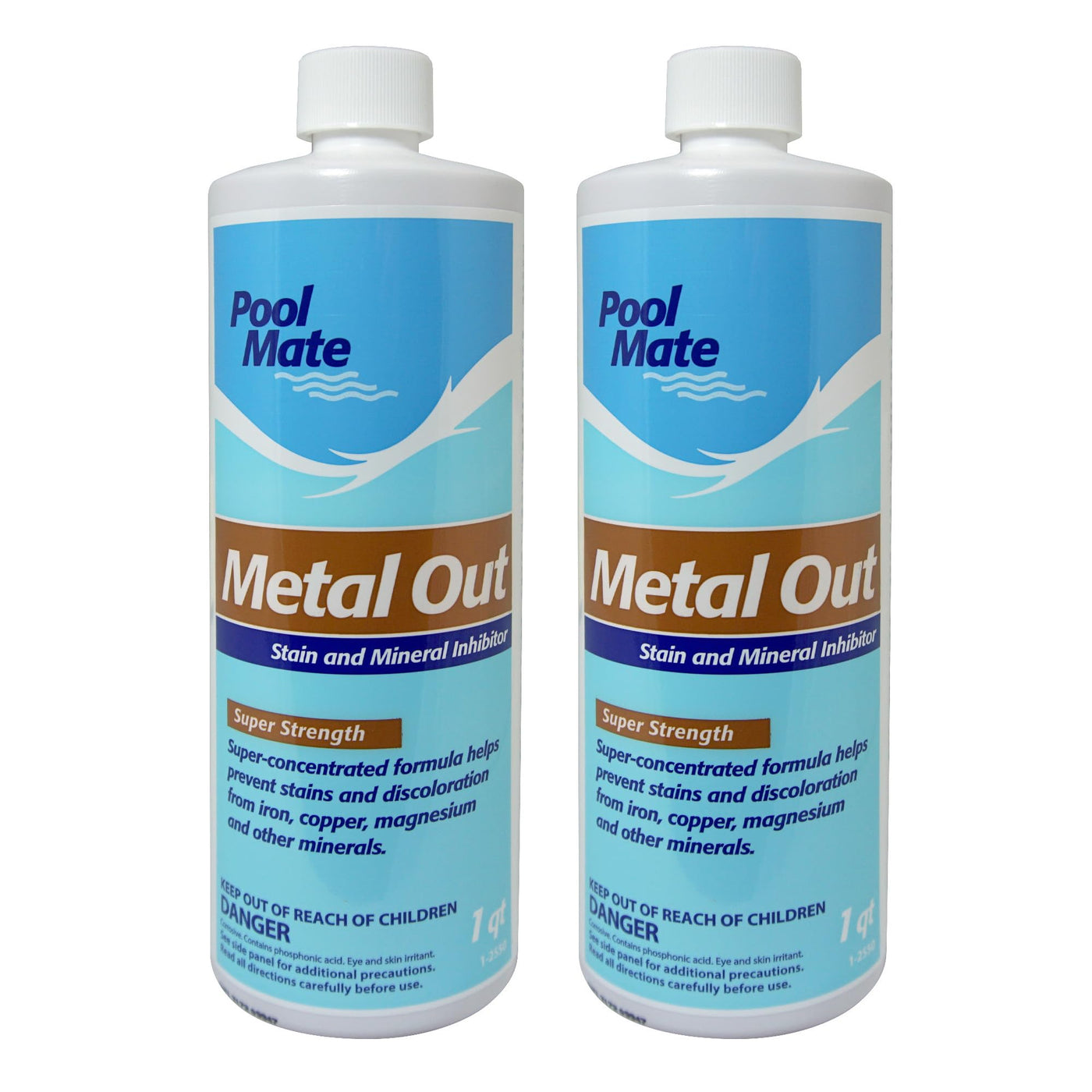 Pool Mate Metal Out Is Especially Formulated To Help Prevent Discoloration Of Pool Water Due To Iron, Calcium, Magnesium, Copper And Other Minerals And Metals. This Product Is Particularly Ideal For Pools Using Well Water Or In Regions Where Heavy Metals Are Naturally Present In The Water. With Regular Use, Pool Mate Metal Out Is Ideal For Controlling General Stains And Helps Maintain A Sparkling Clean Pool. This Product Helps Prevent Discoloration Of Pool Water Due To Iron, Calcium, Manganese, Copper And Other Metals And Minerals Which May Be Present In The Water Supply. This Product Is An Excellent General Purpose Sequestrant Which Helps Protect Plumbing And Pool Walls From Rust, Stain And Scale. It Should Be Used For All Pool Openings And Closings And Throughout The Season As Needed. For Initial Filling Of Pool, If Iron Or Other Metallic Contaminants Are Suspected, Add One Quart Of This Product For Each 10,000 Gallons Of Pool Water. Add This Product While The Pool Is Being Filled And Before Chlorine Is Added. To Correct An Existing Colored Water Problem Due To The Presence Of Minerals In The Pool Water, First Close The Pool To All Swimmers. Leave The Filter Pump Running. Stop Chlorinating The Pool And Allow The Chlorine Level To Drop To Zero. Lower The Ph Of The Pool Water To 6.8 With A Ph Decreaser. Lowering The Ph Will Redissolve The Metallic Impurities. Add One Quart Of This Product Per 10,000 Gallons Of Water And Allow The Pool Water To Circulate Overnight, Or Until The Water Is Clear. Readjust The Ph Of The Pool Water Between 7.2 To 7.8 With A Ph Increaser. Begin Normal Chlorination And Pool Operation. Swimming May Resume When Chlorine Residual Is 1.0 To 3.0 Ppm. To Make Up For Loss Of This Product Due To Backwashing And/Or Splash-Out, Add One Quart Of This Product For Each 20,000 Gallons Of Pool Water, Once Each Month.