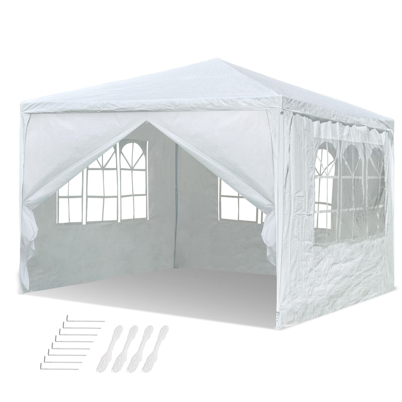 Features:- Outdoor Wedding Tent - 10X10 Ft Wedding Tent Offers 100 Sq. Ft. Coverage, Can Accommodate Approx. 10 People For Dining Or Party, Providing Cool Shade For Relaxing Outdoor Gathering, Ideal For Wedding, Outdoor Events, House Warming Party- Detachable Sidewalls - 4 Sidewalls With Hook &Amp; Loop Fastener For Easy Attaching And Removal According To Your Need, 3 Sidewalls With Transparent Church Window To Let In Plenty Of Natural Light &Amp; Provide Clear Landscape Views- Easy To Assemble &Amp; Store - No Tools Required For Easy Assembly And Disassembly; Lightweight Tubes Can Be Completely Detached And Conveniently Stored Into Your Car Truck- Durable Material - Tent Roof &Amp; Sidewalls Are Made Of Water-Resistant &Amp; Uv-Resistant Pe, Ideal For Outdoor Use; Metal Frame With Rust-Resistant Powder Coating For Durability - Ground Stakes For Stability - Extra Straight Fittings For Stably Securing The Connection Between Tubes; Baseboard With Holes For Inserting Stakes To Ensure Stability When Using On The Lawn, Can Use With Sand Bags (Not Included) To Add Extra Stabilityspecifications:- Model: 10 X 10 Ft - Overall Dimension(Lxwxh): 10 X 10 X 8 1/6 Ft (3 X 3 X 2.5 M) - Sidewall Size(Lxh): 10 X 6 7/12 Ft (3 X 2 M) - Frame Material: White Powder Coated Steel /W Pe Joint Fittings - Net Weight: 17.6 Lbs (8 Kg)Package Contents:- 1X Top Cover- 3X Sidewalls With Windows- 1X Sidewall With Zipper- 1X Tube Set - 1 Set Of Accessory- 1X Manualnotices: - 1. It Requires 2 People To Set Up The Tent For Fast Erection. - 2. Polyethylene Is Not Fireproof, Please Keep Away From Fire Sources. - 3. Please Don'T Leave Canopy Up Overnight Or Under Bad Weather Conditions. Tents Are Temporary Structures Designed To Handle Most Normal Weather Conditions. Evacuation Of Tents Is Recommended Under Bad Weather Or Other Unsafe Conditions
