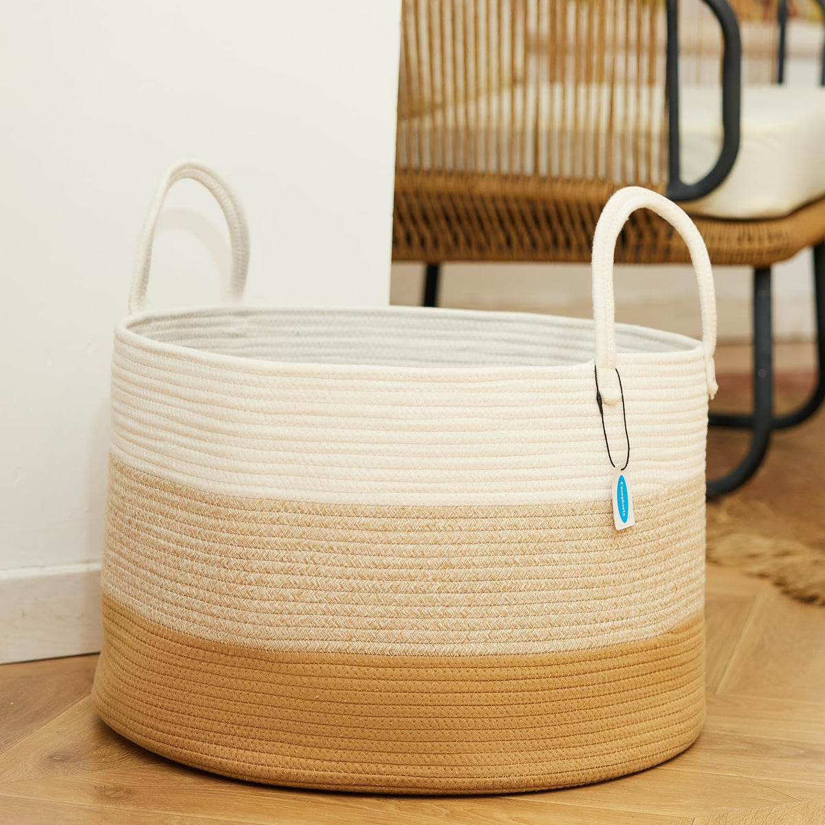 Q: What materials are used in the Casaphoria Blanket Basket?A: The Casaphoria Blanket Basket is made from premium cotton ropes, ensuring durability and a soft touch. This material is safe for use in any area of your home, as it features no sharp edges.