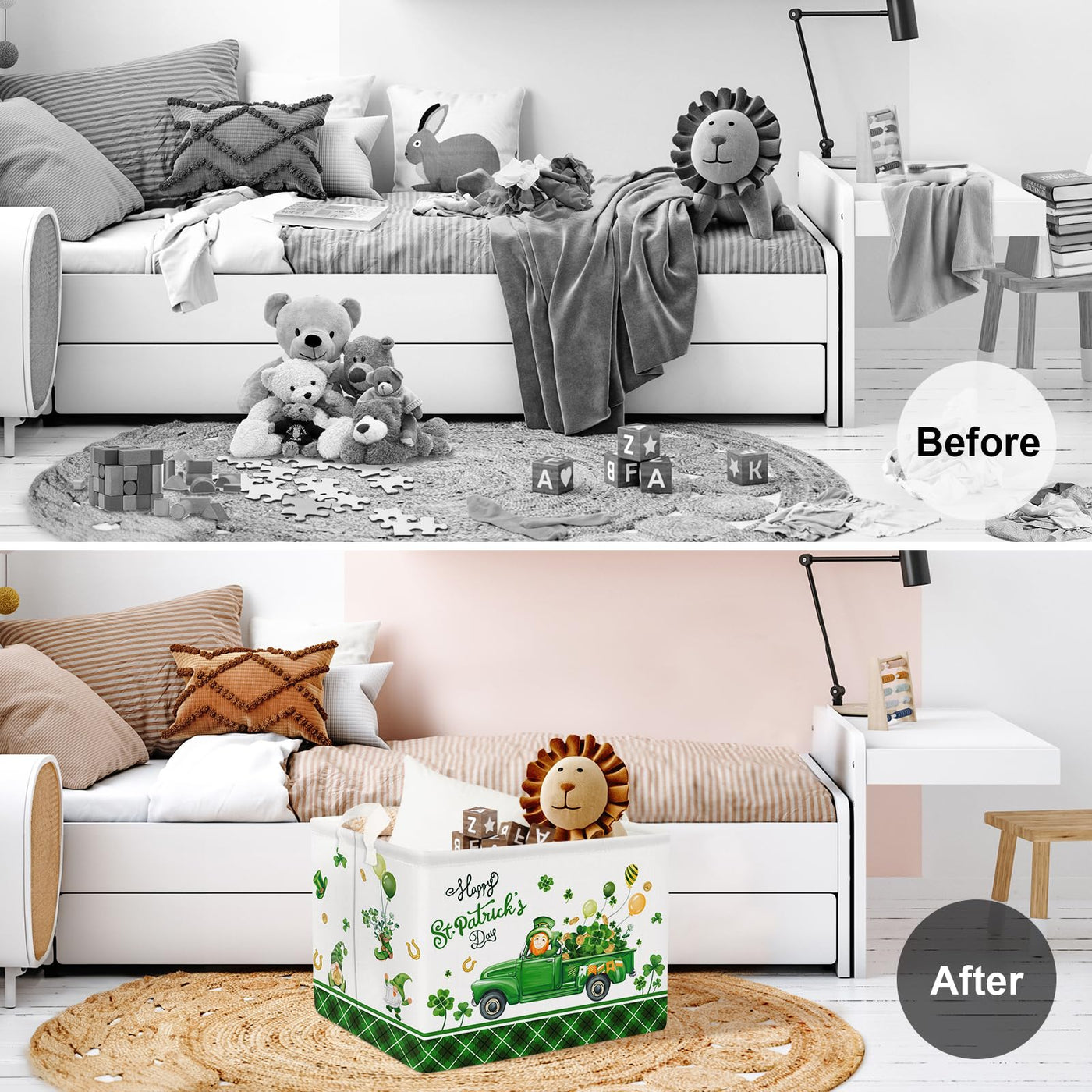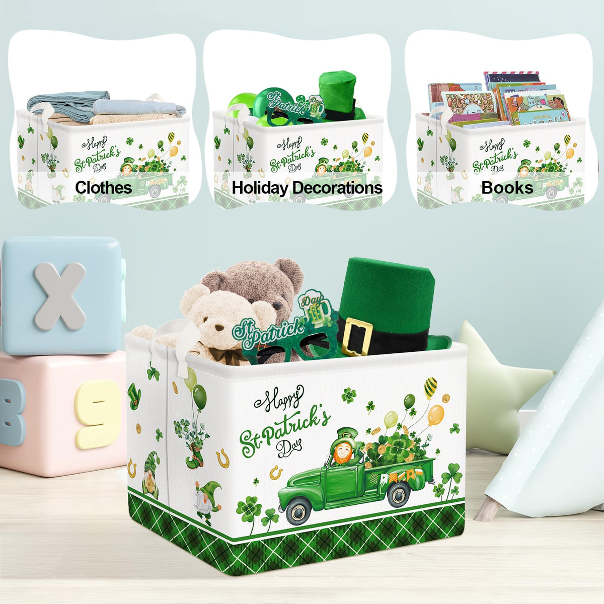 Q: What makes this storage basket a great gift option for St. Patrick's Day?A: The festive design features a pickup truck adorned with four-leaf clovers and balloons, making it an ideal gift for St. Patrick's Day celebrations while being functional and practical.