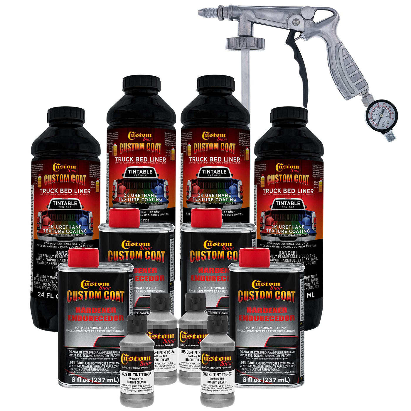 Custom Coat Bed Liner Custom Tintable Color Kit, 1 Gallon (4 Quart) Kit Includes: 4 - 21 Fl. Oz. Cans Of Tintable Truck Bed Liner Base 4 - 8 Fl. Oz. Cans Custom Coat Standard Hardener 4 - 3 Fl. Oz. Bottles Of Custom Shop Basecoat Color Tint 1 Custom Coat Applicator Spray Gun With Regulator Product Technical Data Sheet And Usage Guide Manual Custom Coat Features And Benefits Easy To Use, As You Just Mix In The Hardener, Shake It, And Then Spray, Roll Or Brush It Onto A Surface! Waterproof, Heat, And Uv Resistant, So It Protects Coated Surfaces From Rust And Corrosion. A Flexible Textured Coating That Will Resist Chipping While Providing Impact Protection And Abrasion Resistance. Extremely Durable With Excellent Surface Adhesion And Helps Deaden Sounds And Vibrations. Available With A Tintable Base That Allows You To Create Your Own Custom Color Or Multi-Colored Look. Custom Coat Bed Liner Is A Premium Durable Long-Lasting Textured 1.67 Voc 2K (Two-Component) Protective Urethane Coating. Custom Coat Is A Very Versatile Product That Can Be Used For An Endless Amount Of Applications But Is Primarily Manufactured For Application Onto Truck Beds, Metal, Aluminum, Fiberglass, Concrete, Wood, And Most Oem Manufacturer&Rsquo;S Finishes. Tintable Truck Bed Liner Coating Is Proportionately Packaged To Simply Mix The Tintable Bed Liner Base, The Hardener, And The Tint, Then Shake It And Spray It! Practical Coverage: 110 - 130 Square Foot Per 1 U.S. Gallon (Standard 4 Quart Size Kit) @ 10-12 Mils Wet Film Thickness. A Standard 4-Quart (1 Gallon) Size Liner Kit On Average Will Cover A Full-Size Truck Short Bed (About 6 Feet Long), But 5 Or 6 Quarts Of Liner Are Needed On Average To Cover A Full-Size Truck Long Bed (About 8 Feet Long).