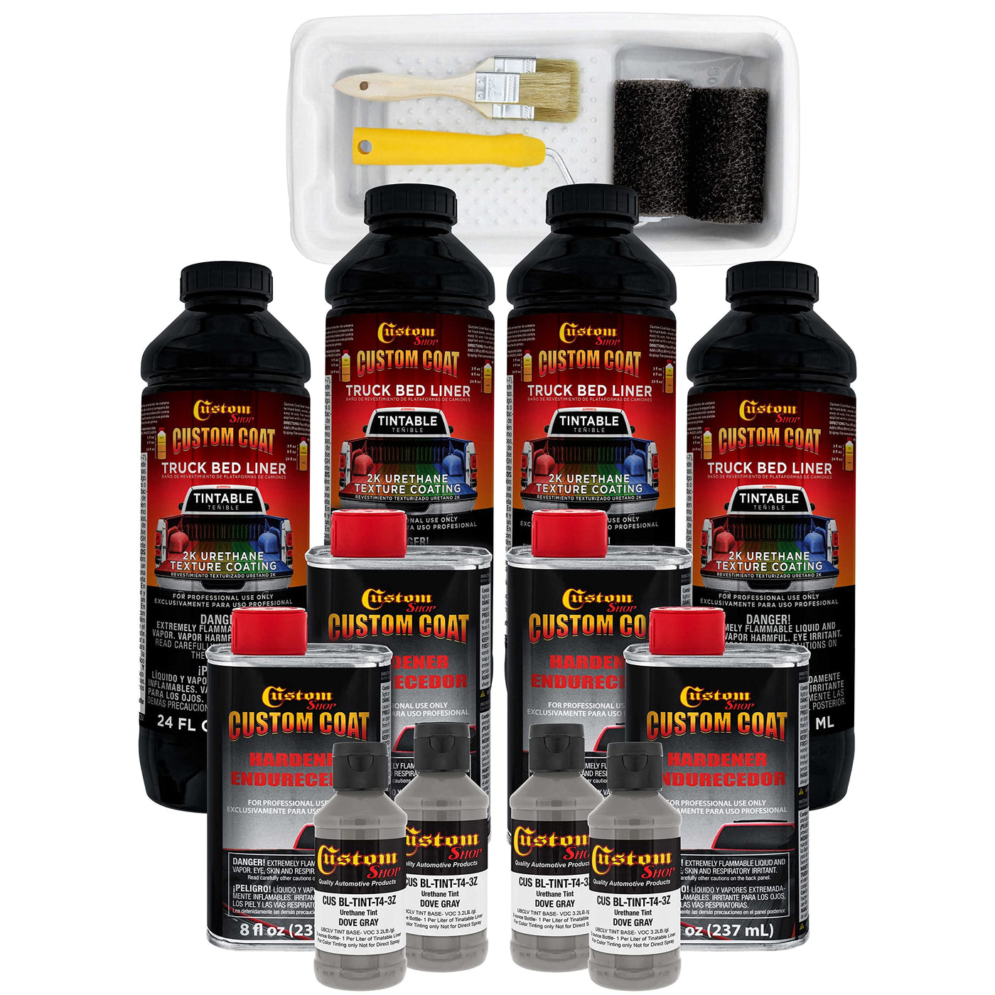 Custom Coat Bed Liner Custom Tintable Color Kit With Paint Roller And Brush Applicator Set, 1 Gallon (4 Quart) Kit Includes: 4 - 21 Fl. Oz. Cans Of Tintable Truck Bed Liner Base 4 - 8 Fl. Oz. Cans Custom Coat Standard Hardener 4 - 3 Fl. Oz. Bottles Of Custom Shop Basecoat Color Tint 1 - Custom Coat Roll-On And Brush-On Applicator Kit (2 Rollers, Frame, Roller Tray With Liner, 2 Brushes) Product Technical Data Sheet And Usage Guide Manual Custom Coat Features And Benefits Easy To Use, As You Just Mix In The Hardener, Shake It, And Then Spray, Roll Or Brush It Onto A Surface! Waterproof, Heat, And Uv Resistant, So It Protects Coated Surfaces From Rust And Corrosion. A Flexible Textured Coating That Will Resist Chipping While Providing Impact Protection And Abrasion Resistance. Extremely Durable With Excellent Surface Adhesion And Helps Deaden Sounds And Vibrations. Available With A Tintable Base That Allows You To Create Your Own Custom Color Or Multi-Colored Look. Custom Coat Bed Liner Is A Premium Durable Long-Lasting Textured 1.67 Voc 2K (Two-Component) Protective Urethane Coating. Custom Coat Is A Very Versatile Product That Can Be Used For An Endless Amount Of Applications But Is Primarily Manufactured For Application Onto Truck Beds, Metal, Aluminum, Fiberglass, Concrete, Wood, And Most Oem Manufacturer&Rsquo;S Finishes. Practical Coverage: 110 - 130 Square Foot Per 1 U.S. Gallon (Standard 4 Quart Size Kit) @ 10-12 Mils Wet Film Thickness. A Standard 4-Quart (1 Gallon) Size Liner Kit On Average Will Cover A Full-Size Truck Short Bed (About 6 Feet Long), But 5 Or 6 Quarts Of Liner Are Needed On Average To Cover A Full-Size Truck Long Bed (About 8 Feet Long).