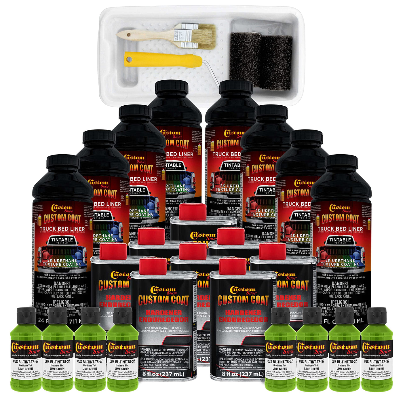 Custom Coat Bed Liner Custom Tintable Color Kit With Paint Roller And Brush Applicator Set, 2 Gallon (8 Quart) Kit Includes: 8 - 21 Fl. Oz. Cans Of Tintable Truck Bed Liner Base 8 - 8 Fl. Oz. Cans Custom Coat Standard Hardener 8 - 3 Fl. Oz. Bottles Of Custom Shop Basecoat Color Tint 1 - Custom Coat Roll-On And Brush-On Applicator Kit (2 Rollers, Frame, Roller Tray With Liner, 2 Brushes) Product Technical Data Sheet And Usage Guide Manual Custom Coat Features And Benefits Easy To Use, As You Just Mix In The Hardener, Shake It, And Then Spray, Roll Or Brush It Onto A Surface! Waterproof, Heat, And Uv Resistant, So It Protects Coated Surfaces From Rust And Corrosion. A Flexible Textured Coating That Will Resist Chipping While Providing Impact Protection And Abrasion Resistance. Extremely Durable With Excellent Surface Adhesion And Helps Deaden Sounds And Vibrations. Available With A Tintable Base That Allows You To Create Your Own Custom Color Or Multi-Colored Look. Custom Coat Bed Liner Is A Premium Durable Long-Lasting Textured 1.67 Voc 2K (Two-Component) Protective Urethane Coating. Custom Coat Is A Very Versatile Product That Can Be Used For An Endless Amount Of Applications But Is Primarily Manufactured For Application Onto Truck Beds, Metal, Aluminum, Fiberglass, Concrete, Wood, And Most Oem Manufacturer&Rsquo;S Finishes. Practical Coverage: 110 - 130 Square Foot Per 1 U.S. Gallon (Standard 4 Quart Size Kit) @ 10-12 Mils Wet Film Thickness. A Standard 4-Quart (1 Gallon) Size Liner Kit On Average Will Cover A Full-Size Truck Short Bed (About 6 Feet Long), But 5 Or 6 Quarts Of Liner Are Needed On Average To Cover A Full-Size Truck Long Bed (About 8 Feet Long).