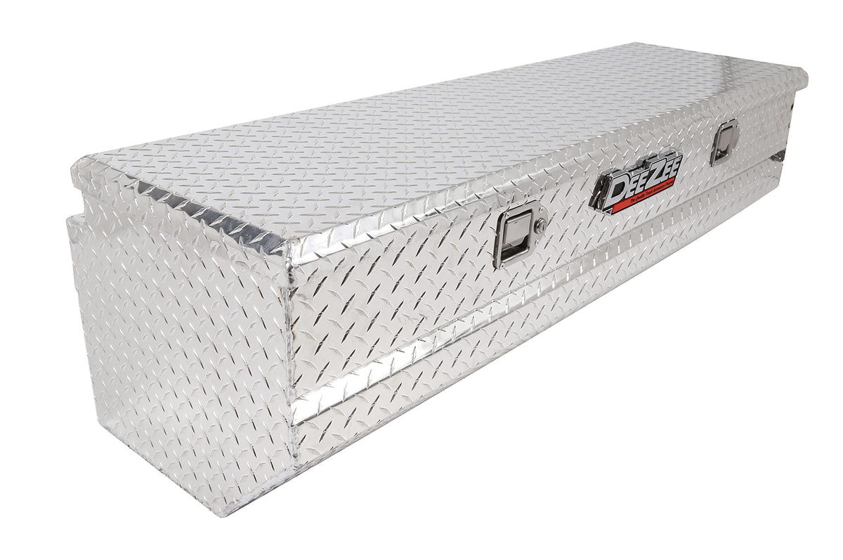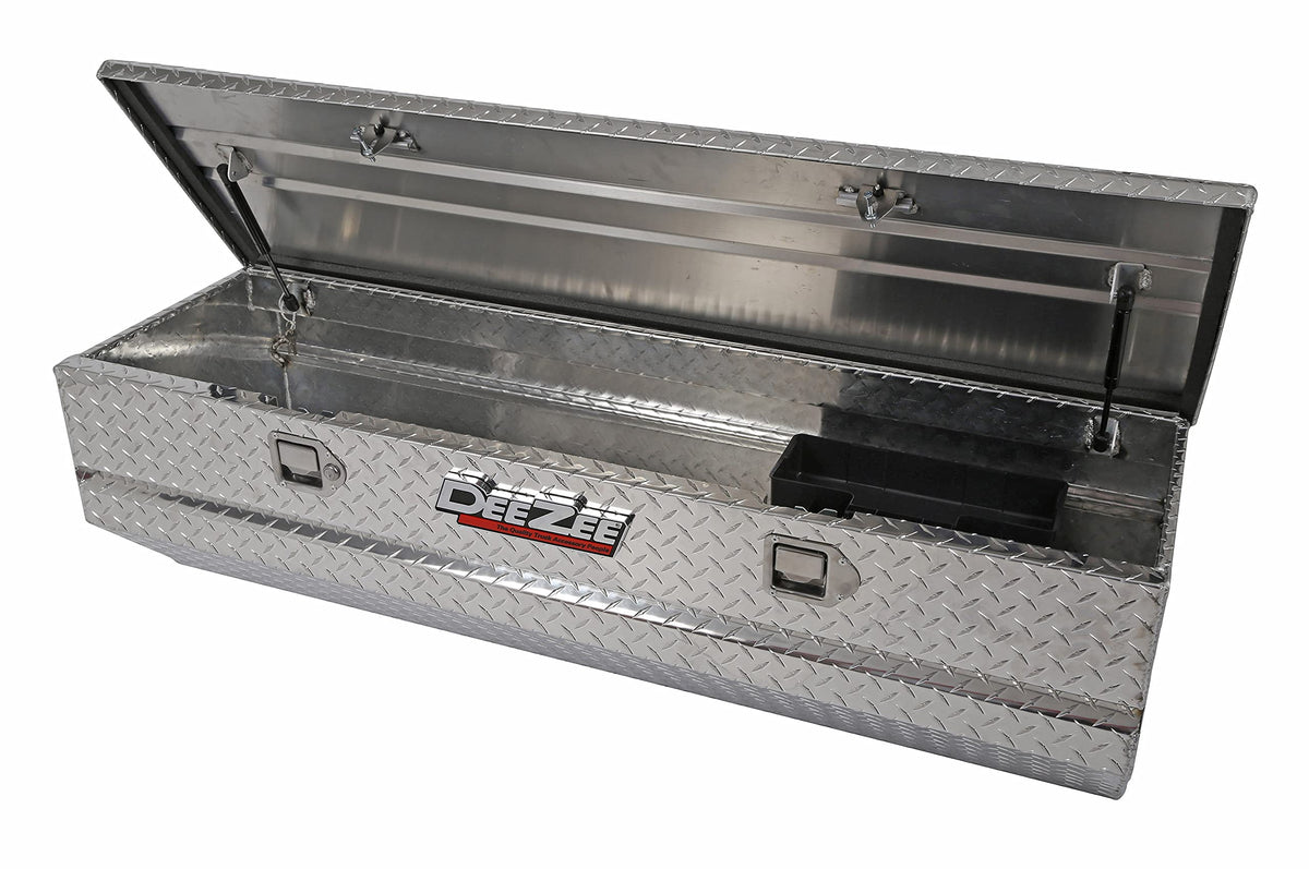 Dee Zee Tool Box - Red Label Chest. Constructed Of Heavy Duty Brite-Tread Aluminum. Crown Style Lid With A Full Pan Double-V Stiffener For Superior Rigidity. Other Features: Lockable Stainless Steel Paddle Handles, Dampened Gas Shocks, Closed Cell Foam Gasket, And Self-Adjusting Strikers. Removable Plastic Tool Tray To Help Keep Small Items Organized.