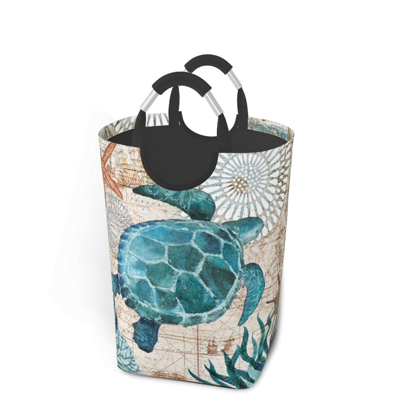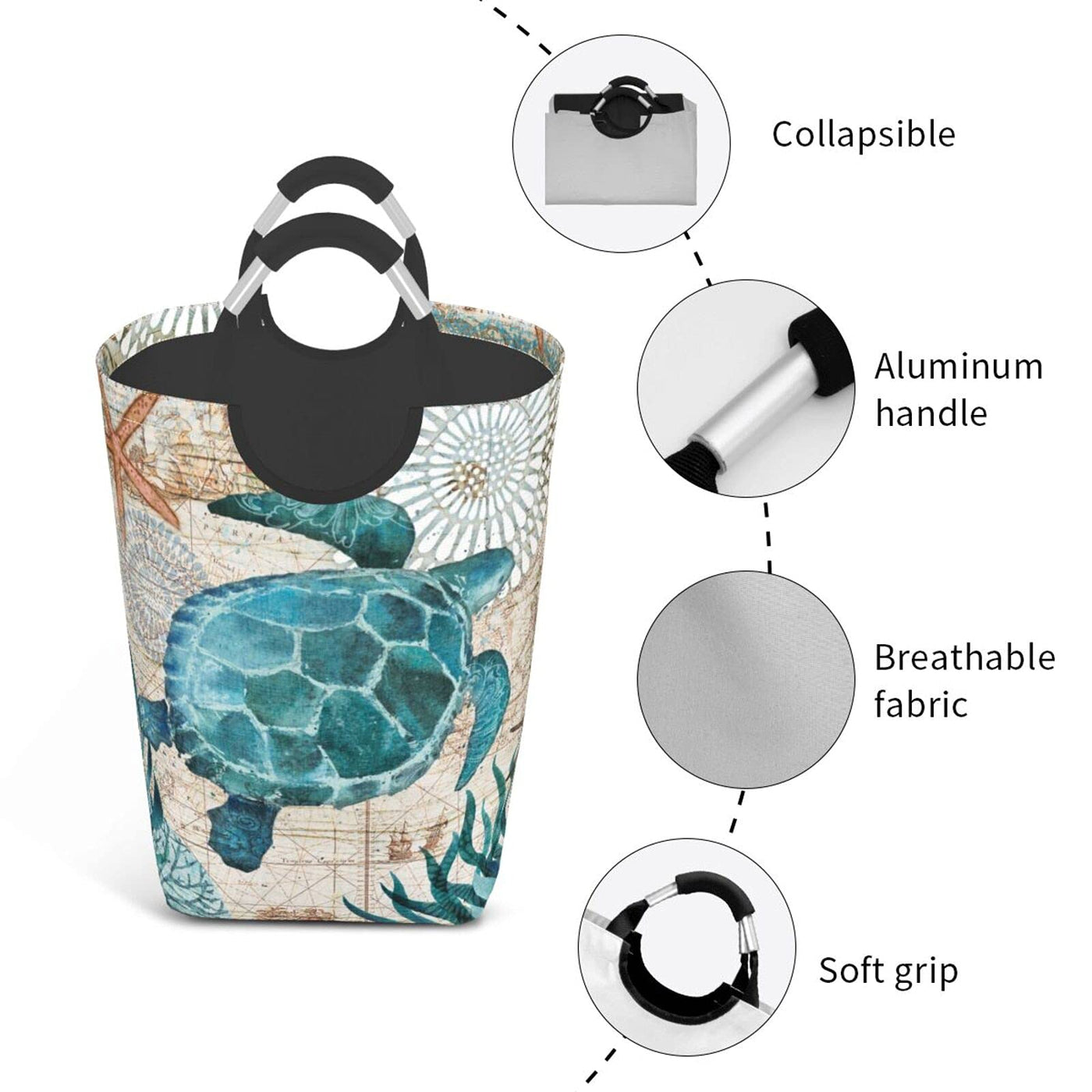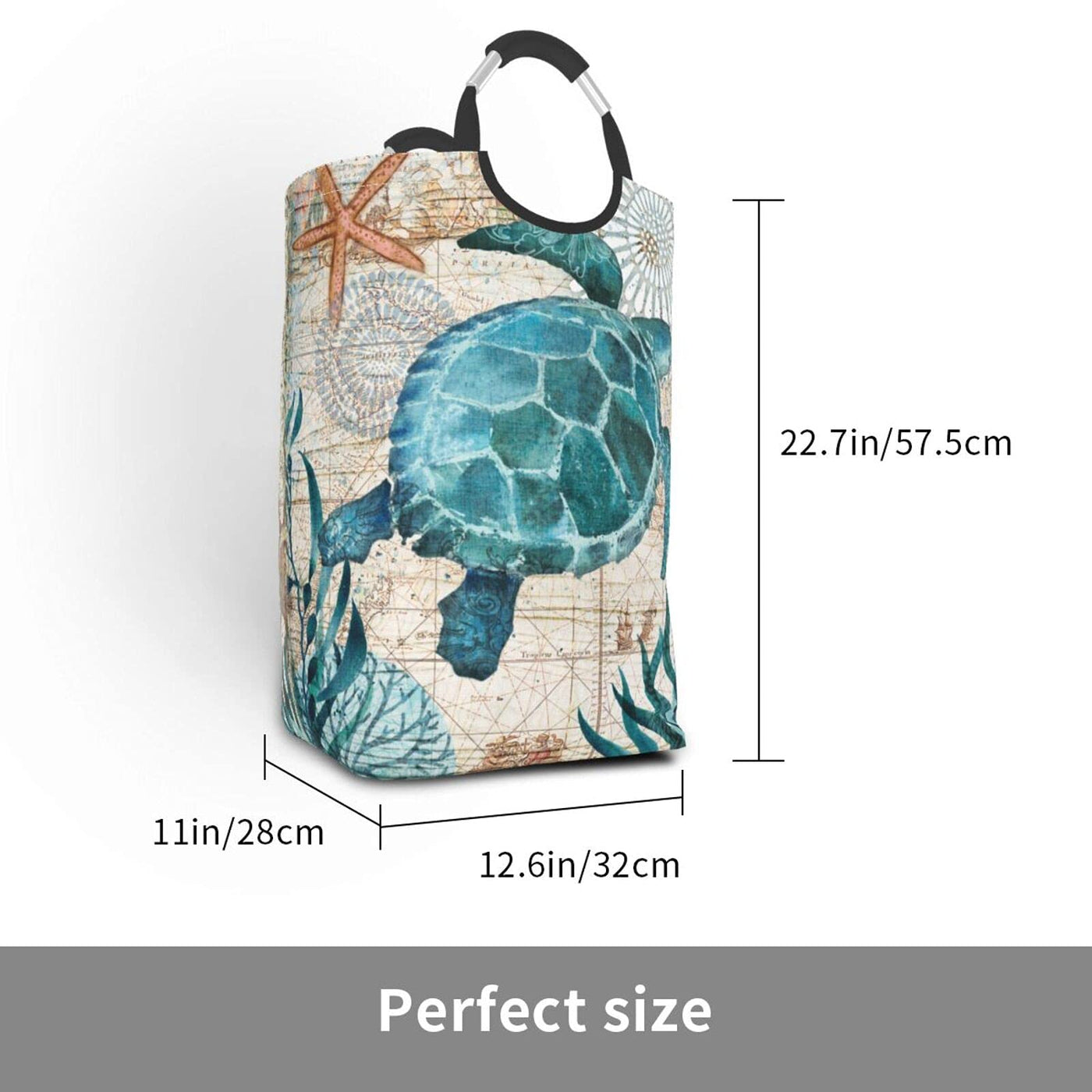 Duduho Sea Turtle Laundry Basket With Handles Nautical Map Retro Ocean Laundry Hamper Toys Storage Organizer Foldable Bucket Was