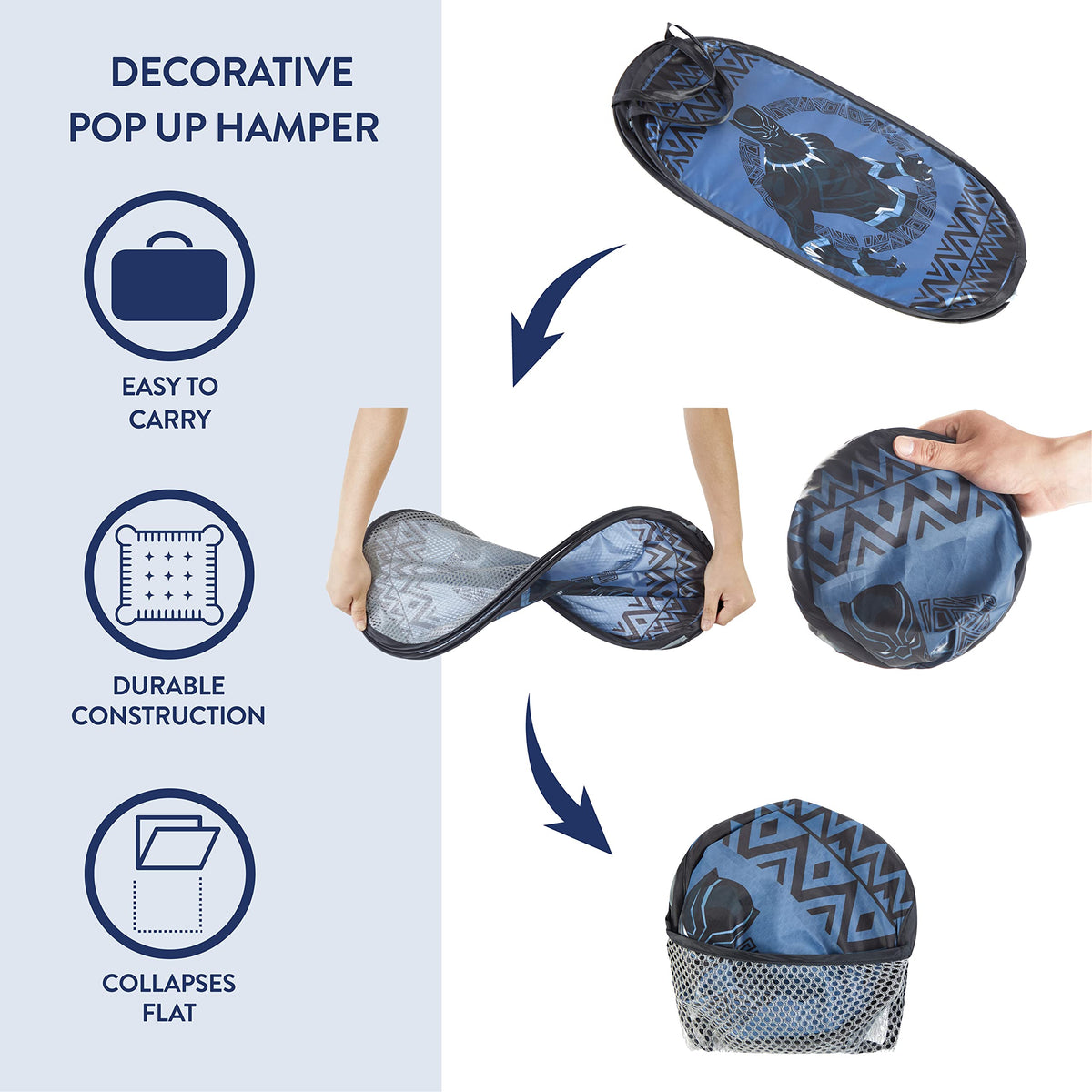 Q: Is the Black Panther hamper easy to transport?A: Yes, this pop up hamper features durable carry handles and a lightweight design, allowing for easy transportation around the house or during travel.