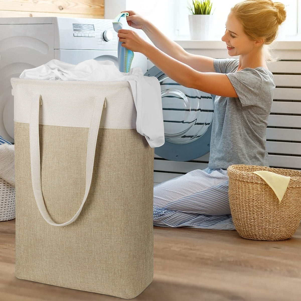Q: What materials are the QY-SC24-2 Slim Laundry Baskets made from?A: The QY-SC24-2 Slim Laundry Baskets are made from a durable, linen-like synthetic material that ensures long-lasting use without the worry of tearing.