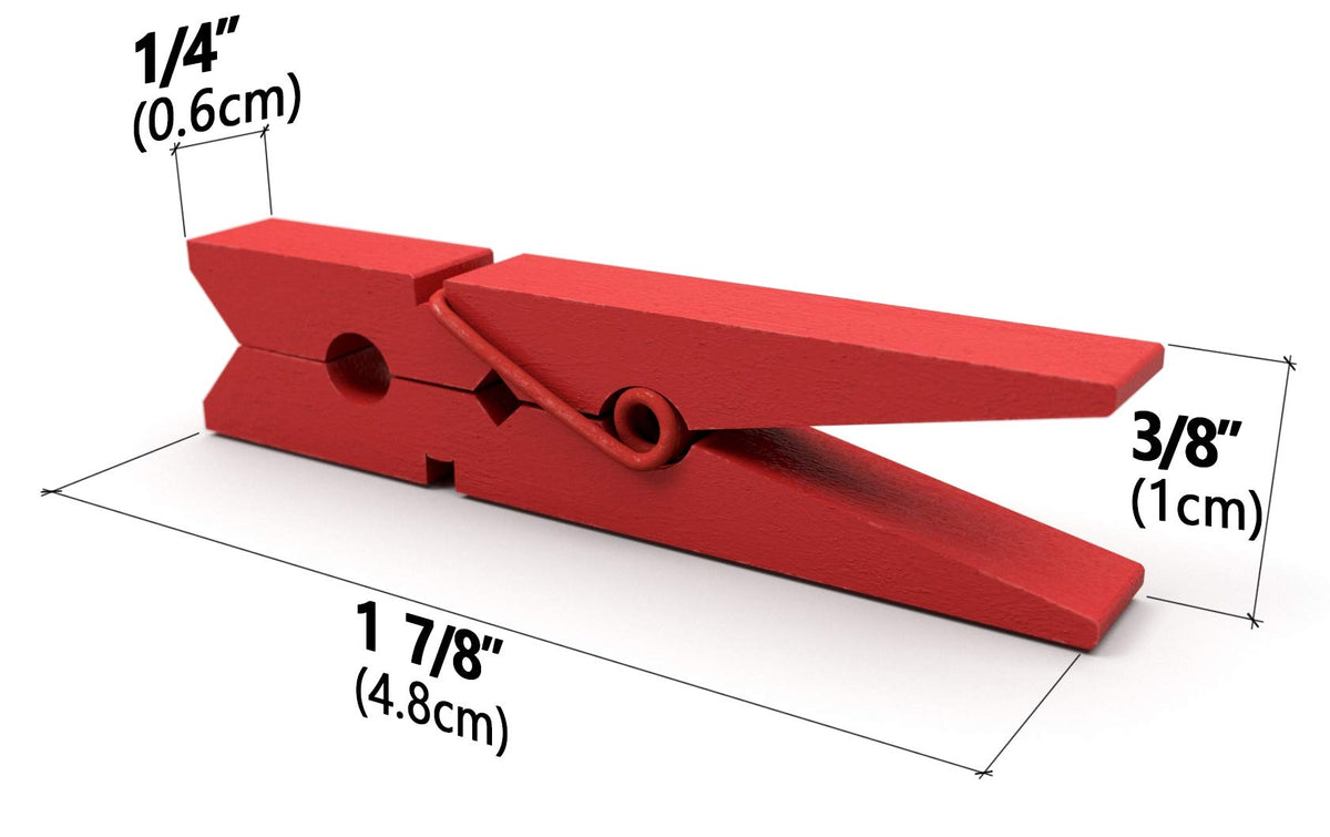 The Clothespins Are Made Of Natural Wood, With Color Paint Finish. It Is Small Size, 4.8Cm (1 7/8 Inchs) Length, 1Cm (3/8 Inches) Width, 0.6Cm ( 1/4 Inches) Thickness. It Is Very Cute, Wonderful For Scrapbook, Kid Hand Craft, Baby Shower, Wedding Party. The Clothespins Have Different Colors: Black, Jacobean, Natural, Red, White. Warning- Have Small Parts. Not For Children Under 3 Years.