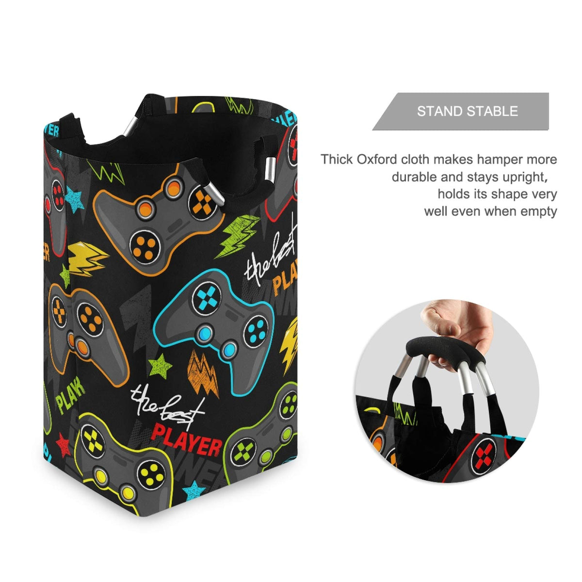 Q: What materials are used in the Qilmy Gamepad Laundry Hamper?A: The Qilmy Gamepad Laundry Hamper is made from high-quality Oxford cloth, which is light, durable, colorfast, and waterproof.