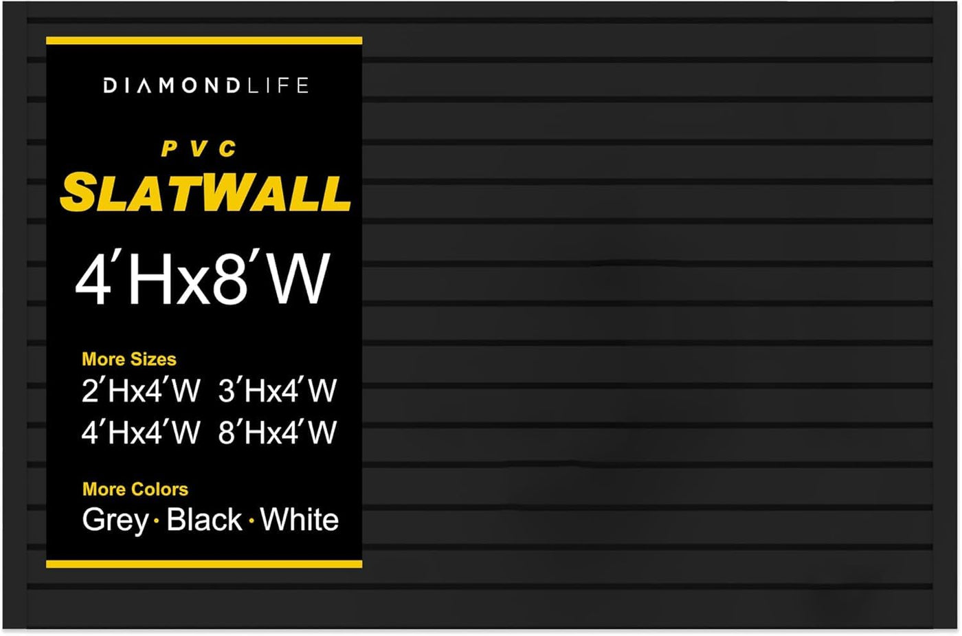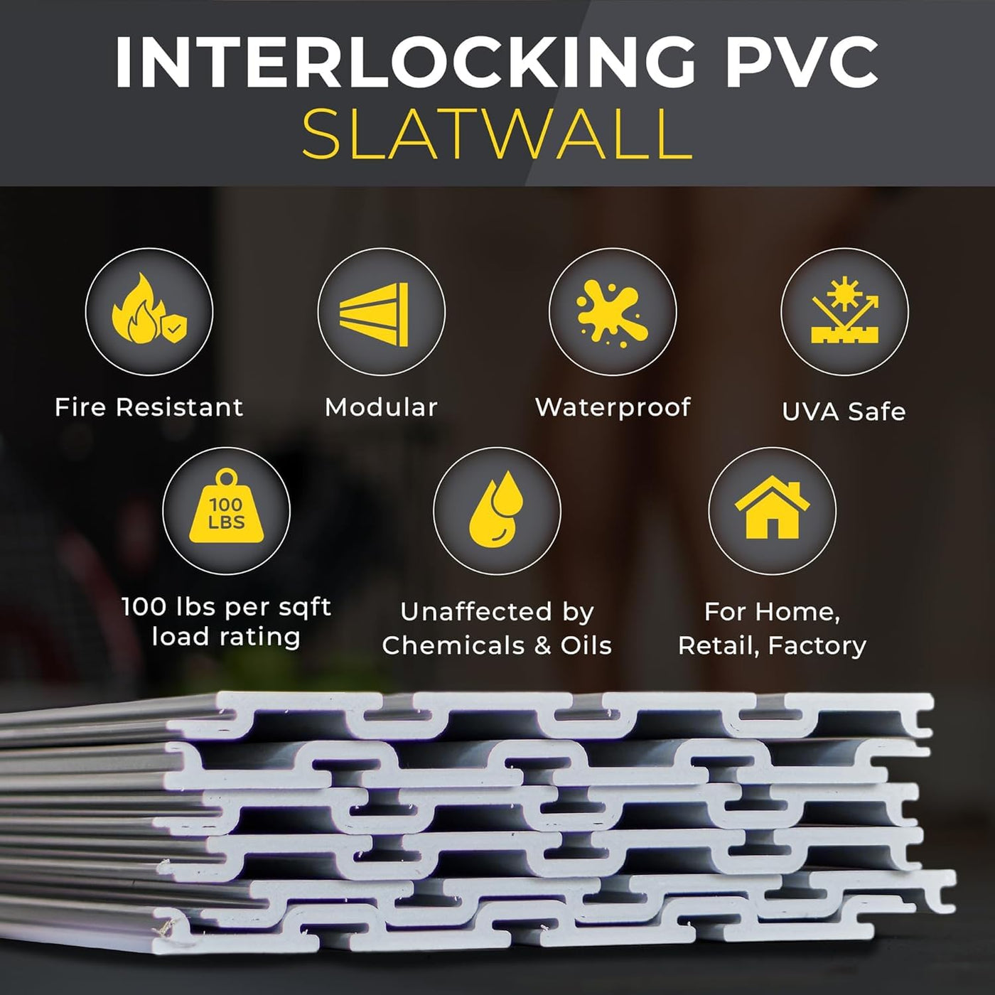 MAKES STORAGE, ORGANIZATION & DISPLAY SIMPLEWARPED, FLIMSY SLAT WALL PANELING REFUSES TO LINE UP RIGHT, leaving you frustrated.That's why our slat wall panel system utilizes the HIGHEST INDUSTRIAL GRADE PVC that's incredibly DURABLE & RESILIENT. Each panel is forced through aluminum dies at tremendous pressures to create sturdy, interlocking slat board shelves with a SEAMLESS FIT that SMOOTHLY ATTACHES WITH JUST A FEW SCREWS onto wood studs, drywall, or masonry.The T-CHANNEL DESIGN of our garage wall panels feature horizontal sections that let you EASILY ADJUST HOOKS & slatwall accesories to create your ideal setup from craft rooms all the way to retail spaces.Designed for INDOOR & OUTDOOR use, each UVA-SAFE sheet for the wall storage system WON'T FADE, DRY OUT, CRACK OR PEEL over time & is completely impervious to water & moisture. Our heavy duty slatwall shelves are also STAIN PROOF & UNAFFECTED BY CHEMICALS & OILS, making them perfect in factories or as wall mounted garage storage.The DLdirect Slatwall garage wall system is available in WHITE, TAN, GREY, & BLACK. With 9 DIFFERENT SIZES, you can easily COMBINE THEM OR CUT THEM DOWN for the perfect fit. Includes finish end caps & mounting hardware!At DLdirect, WE'RE COMMITTED TO MANUFACTURING SUPERIOR QUALITY garage organizers and storage systems that won't let you down. Featured on HGTV, Extreme Makeover Home Edition, DIY to the Rescue, Garage Mahal, Popular Mechanics, & Metal Architecture Magazine, WE'RE PROUD TO OFFER you one of THE LEADING PLASTIC SLATWALLS IN NORTH AMERICA.