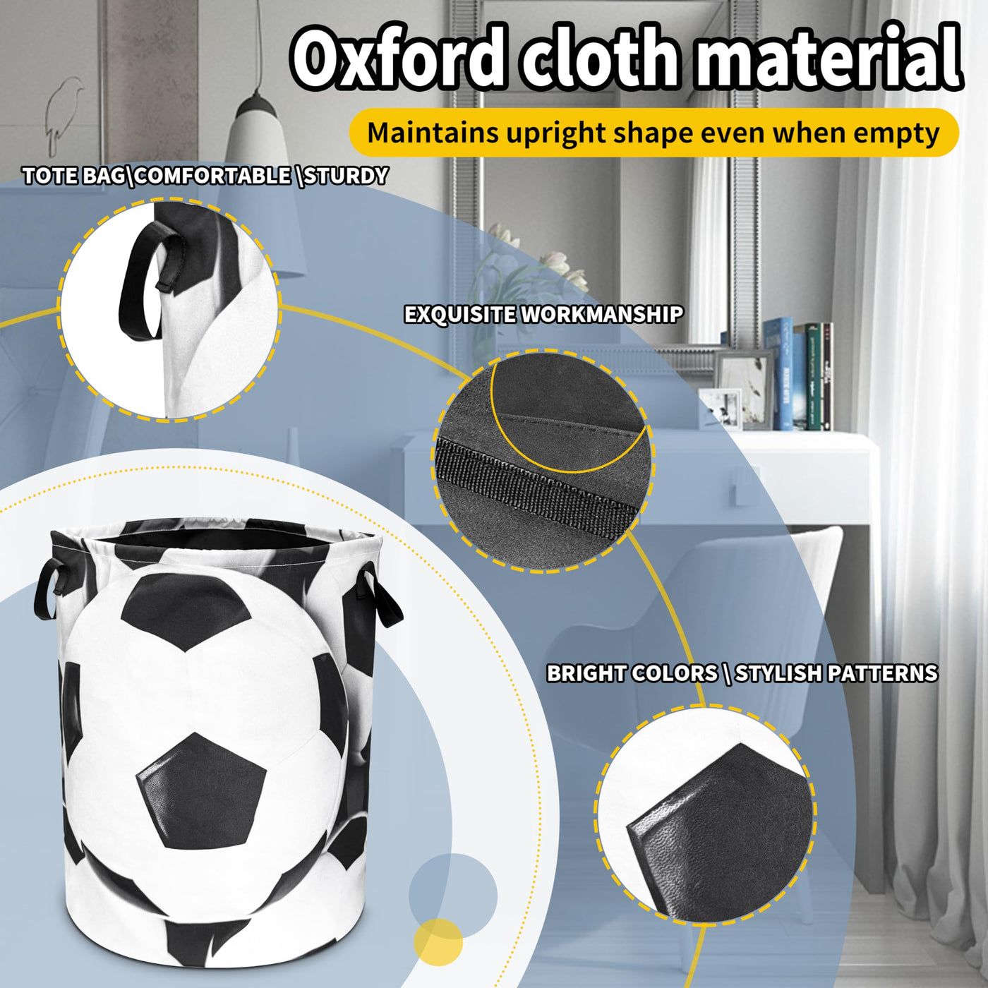Q: What materials are used in the Soccer Laundry Basket?A: The Soccer Laundry Basket is made of lightweight and durable Oxford cloth, featuring exquisite hemming stitching and a lining design that adds beauty and tidiness.