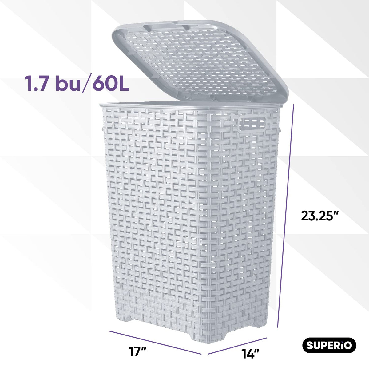 Q: What materials is the Superio laundry hamper made of?A: The hamper is made from durable plastic, designed to be lightweight yet strong enough to hold 16 gallons of laundry while providing an elegant wicker style design.