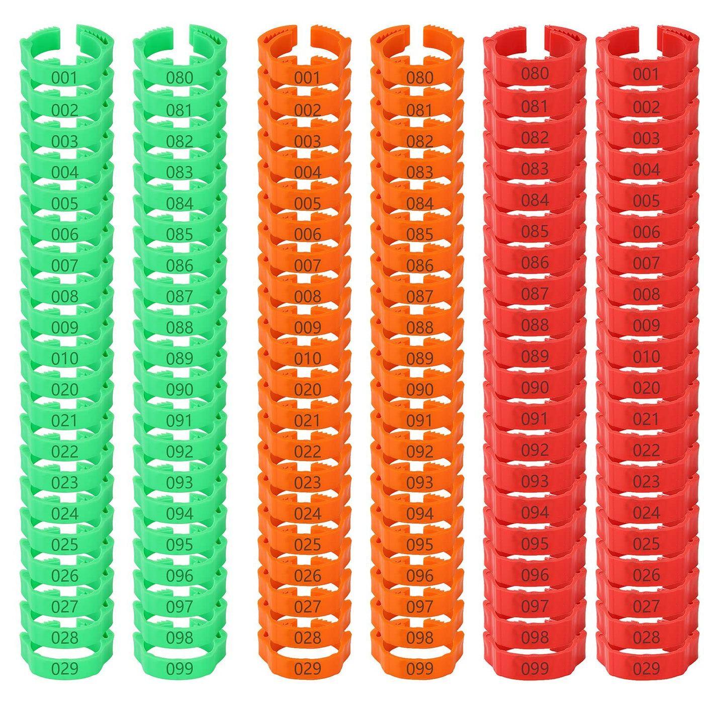 We Can Provide You With An Economical, Practical And Satisfactory Resealable Number Chicken Bird Leg Bands 300 Pcs Chicken Bird Leg Rings With 3 Colors Numbered Chicken Leg Bands Colorful Poultry Leg Bands Clip-On Chicken Ankle Rings For Ducks Gamefowl Turkey Goose Pigeons Why Choosing Our Multicolor Chicken Leg Bands ? -They Come In 3 Colors Which Are Red, Orange And Green, 100Pcs In Each Color. You Can Sort The Birds By Color Easily Because The Colors. - The Size Of Poultry Bands Are Adjustable (Id:0.7- 1 Inch), You Can Adjust The Size Of The Chick Leg Bands To Suit The Chicken'S Ankle Size. - It Has Clear Numbers From 1 To 100, And The Laser-Etched Numbers Are Not Easy To Smear. - The Polyethylene Material, Which Is Strong, Durable, It Wont Be Broken And Can Be Reused For A Long Time. - The Poultry Bands Adopt Simple Clip Design That Is Also Easy To Apply And Remove In Your Poultry Without Using Any Tools. - It Is Very Suitable For Poultry Management Or Farm To Separate Hatches; It Can Greatly Improve The Efficiency Of Poultry Management. - The Ring Suitable For Adult Poultry Species, Chicken, Hen, Goose, Eagle, Ducks, Chicken, Guinea Pigeons, Gamefowl, Etc. If You Want To Know More About Our Duck Leg Rings, Please Feel Free To Contact Us, We Will Be Happy To Serve You. Hope You Have A Great Shopping Experience! Specification Size:Id: 0.7-1 Inch/18-25Mm Material: Polyethylene Color: Red, Orange, Green Quantity: 100 X Chicken Leg Rings 100 X Chicken Leg Rings 100 X Chicken Leg Rings