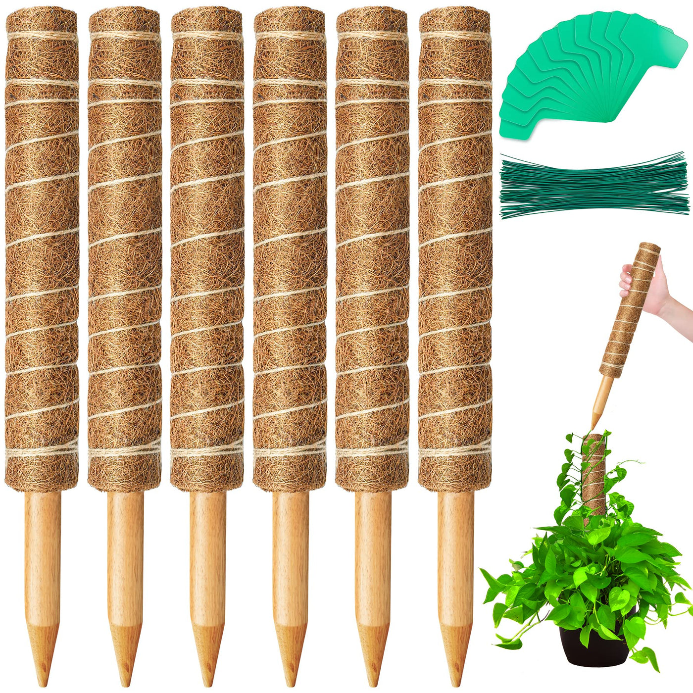 Eaone 6 Pcs 157 Moss Poles, Stackable Coir Totem Pole Plant Support Extension With 12 Pcs Plant Labels And 100 Pcs Ties For Potted Climbing Plants Monstera Creepersmade Of Natural Coir Moss Fiber (Natural Fibre Extracted From The Husk Of Coconut), Our Coir Totem Pole Is Aesthetically Pleasing, Environmentally-Friendly&Nbspand Safe For Your Plantseach Coir Moss Stick Is 16 Inches Long You Can Use Only One To Offer Support For The Plants, And Then Stack The Moss Poles To Make Them Taller As Your Plants Grow So Convenient The Sharpened Wooden Stake Can Be Easily Inserted Into The Soil, Providing Strong Support For Plant Expansionthe Plant Labels Can Be Written With Marker Pens It Help You To Identify Your Plantsthe Ties Can Help To Fix The Plants On The Coir Totem Pole, Keep The Plants Look Tidy And Grow Upwards Specification:Material:&Nbspnatural Coir Moss Fibersingle Coir Moss Pole Height: 157 Inchespackage Weight: 710Gpackage: 415*275*45Cmpackage Includes:6 Packs 157 Coir Totem Pole12 Pcs Plant Labels100 Pcs Ties