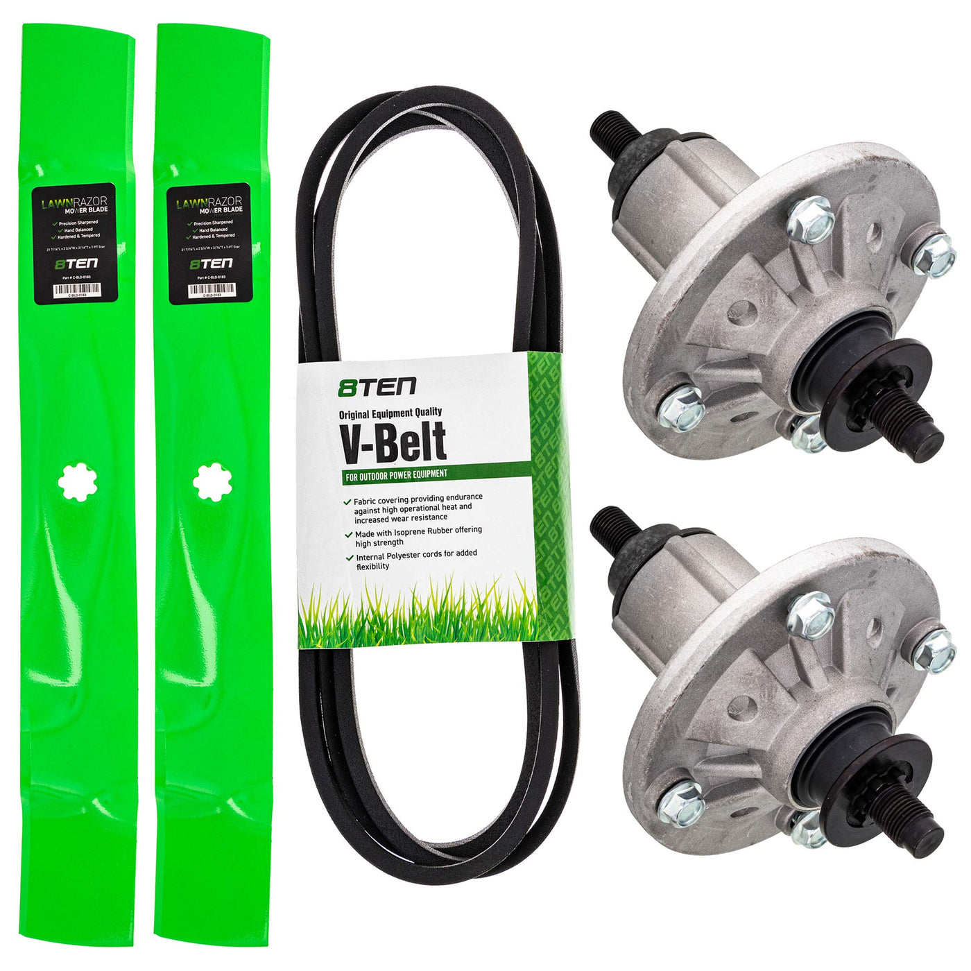 Included Items In This Bundle:(Qty 2) 8Ten 810-Csp2226N Deck Spindlesubstitute For Oem Part Numbers(S): Gy21099, Gy21098, Gy20962, Gy20893, Gy20867, Gy20592, Gy20454, Auc15811(Qty 1) 8Ten 810-Cbl2331T Deck Beltsubstitute For Oem Part Numbers(S): Spm215471655, Gy20570, Gx20072(Qty 2) 8Ten 810-Cbl2305D Lawnrazor Mulching Bladesubstitute For Oem Part Numbers(S): Uc21583, Gy20850, Gx22151, Am141033, Am141031, Am137333, Am137328, 578431911Fits The Following Oem Models:John Deere - 102, 105, 107S, 115, 125, 135, D100, D105, D110, D120, D125, D130, E100, E110, E120, E130, La100, La105, La110, La115, La120, La125, La135, X105, X106, X110, X120, X125, X126, X145