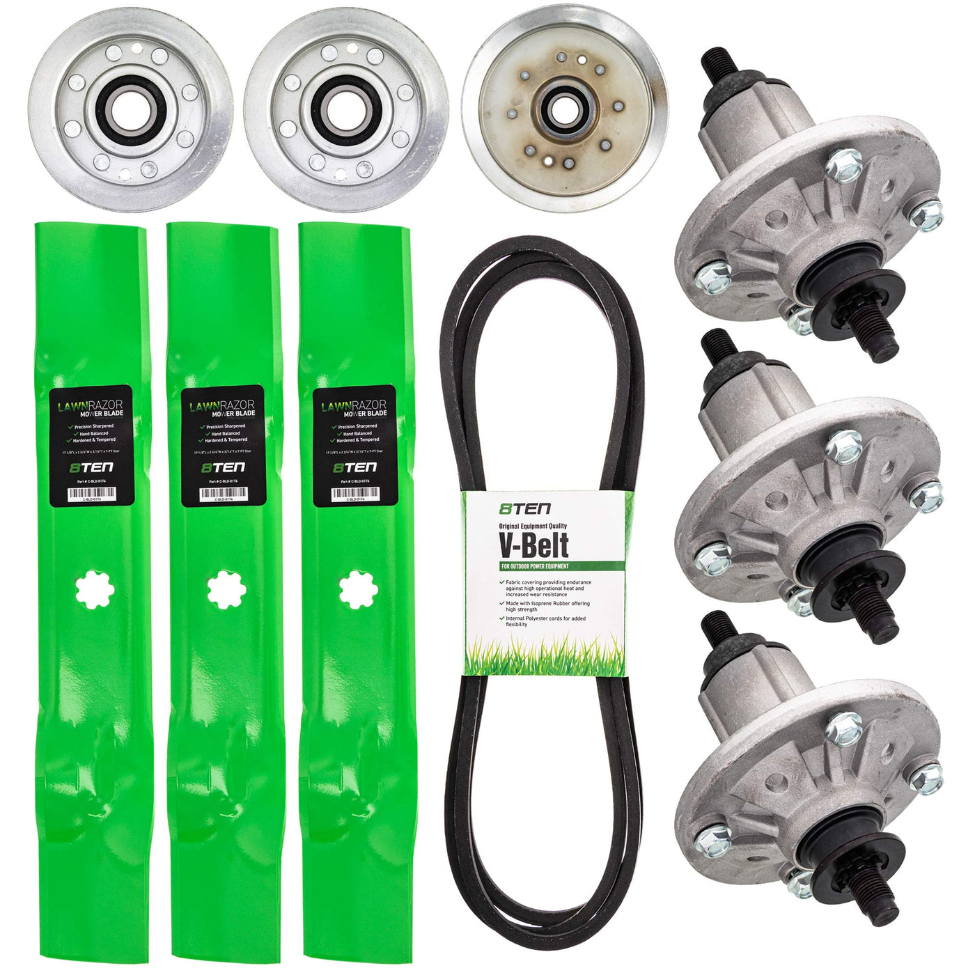 Included Items In This Bundle:(Qty 2) 8Ten 810-Cid2225L Idler Pulleysubstitute For Oem Part Numbers(S): Gy22172, Gy20067(Qty 1) 8Ten 810-Cid2228L Flat Idler Pulleysubstitute For Oem Part Numbers(S): Gy22082, Gy20629, Gy20110, 756-05034A, 756-05034(Qty 3) 8Ten 810-Csp2226N Deck Spindlesubstitute For Oem Part Numbers(S): Gy21099, Gy21098, Gy20962, Gy20893, Gy20867, Gy20592, Gy20454, Auc15811(Qty 1) 8Ten 810-Cbl2213T Deck Beltsubstitute For Oem Part Numbers(S): Gx21833, Gx20571(Qty 3) 8Ten 810-Cbl2398D Lawnrazor Deck Bladesubstitute For Oem Part Numbers(S): Gy20852Fits The Following Oem Models:John Deere - 145, 155C, D140, D150, D160, E140, E150, E160, E170, La130, La140, La145, La155, La165, X165, X166