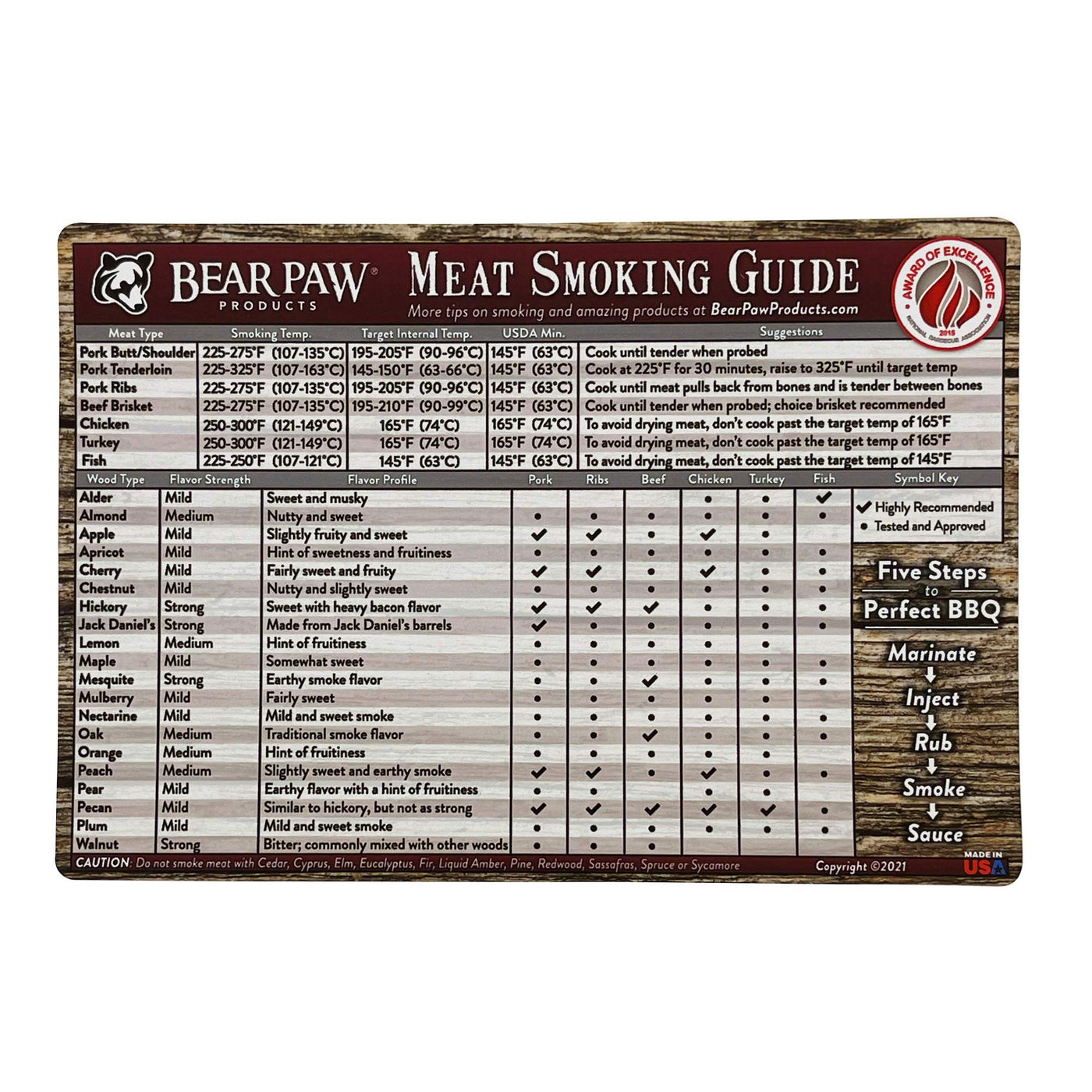 Take Your Meat Smoker Experience Up A Notch With The Best All-In-One Magnetic Meat Smoking Guide Around. Durable And Perfectly Sized, The Bear Paws Meat Smoking Magnet Fuses Convenience With Professional Experience To Bring You The Best In Smoking Meat Accessories. Our Magnet Provides A Comprehensive Reference Of The Most Important Information For Smoking Meat. This Clear, Easy-To-Read Chart Gives You The Wood Smoke Flavor Index Of The 20 Most Popular Woods For Smoking. An Easy Checklist Suggests Ideal Wood Pellet And Meat Pairings For Unbelievable Flavor. Get The Most Out Of Your Meat Smoker With The Smoking Temperature Chart Provided At The Top Of The Magnet, Indicating The Correct Setting For Your Smoker In Both Fahrenheit And Celsius. We Provide Both The Usda Minimum Temperature For Safe Meat Preparation And Our Target Internal Meat Temperature Guide So That Youll Know Exactly When Youve Achieved Tender, Flavorful Meat. Finally, Weve Compiled The Best Pro Tips From Award-Winning Pitmasters To Make Your Bbqs The Stuff Of Legends. Our Information-Packed Reference Magnet Is A 5.5 X 8, Perfect For Keeping Handy During Meat Preparation. Its Heavy-Duty Construction And Lamination Mean That It Is Weather-Resistant And Will Last For Years To Come. A Favorite Of Bbq Pros, The Meat Reference Guide Magnet Is The Perfect Bbq Accessory To Gift To The Meat Lover In Your Life.
